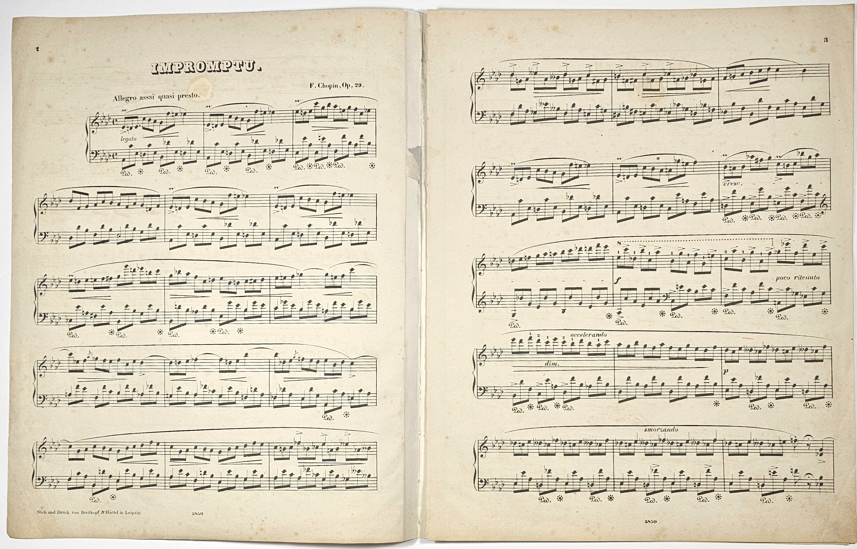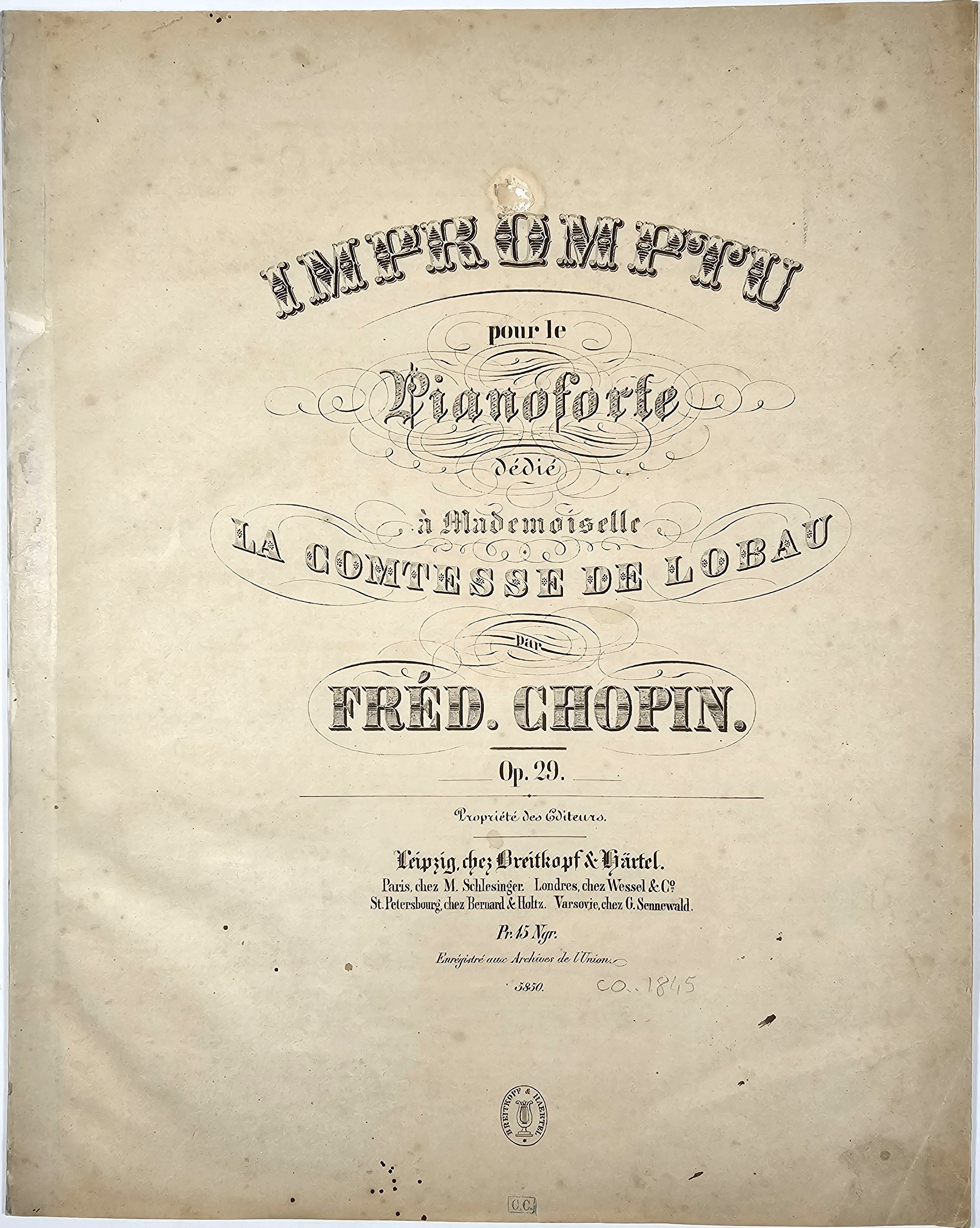 4 (30,2 cm) s. 7. Op. 29, Lipsk Brietkopf & Hartel. Kobylanka s. 74, Platzman 29-BH-2. Strona tyt. wydrukowana z płyty niemieckiego pierwodruku. Nieznaczne przybrudzenia. Przy dolnej krawędzi pieczęć wydawcy oraz literki C.C. Wydanie za życia Fr. Chopina.