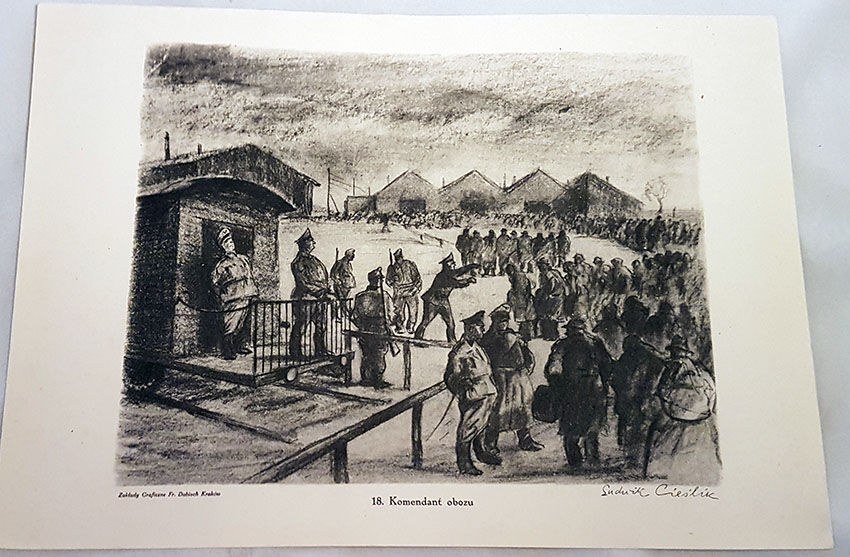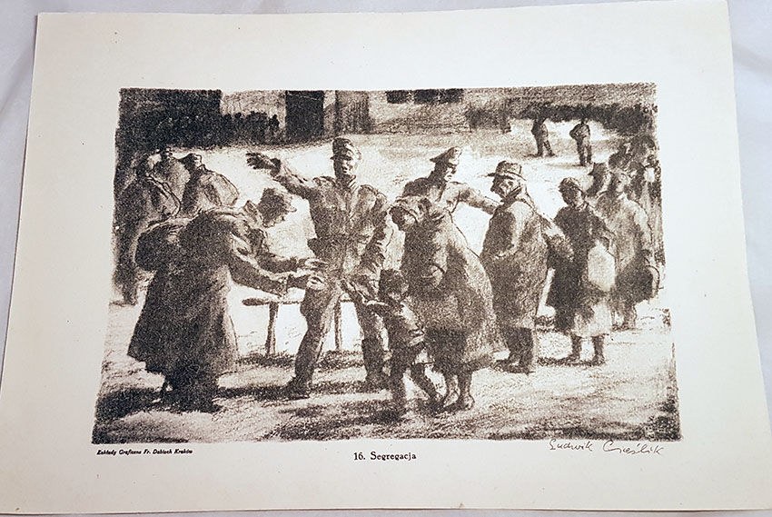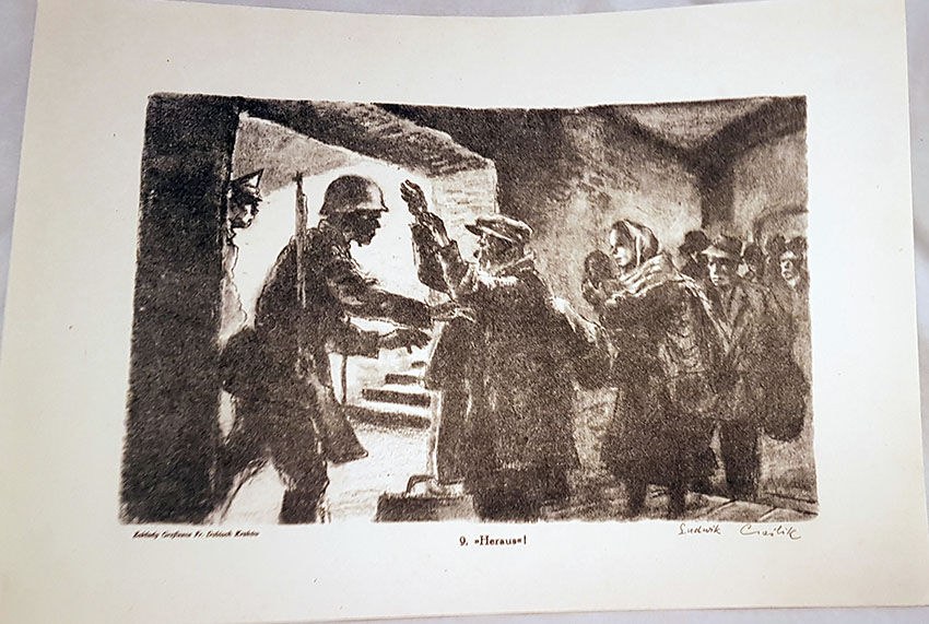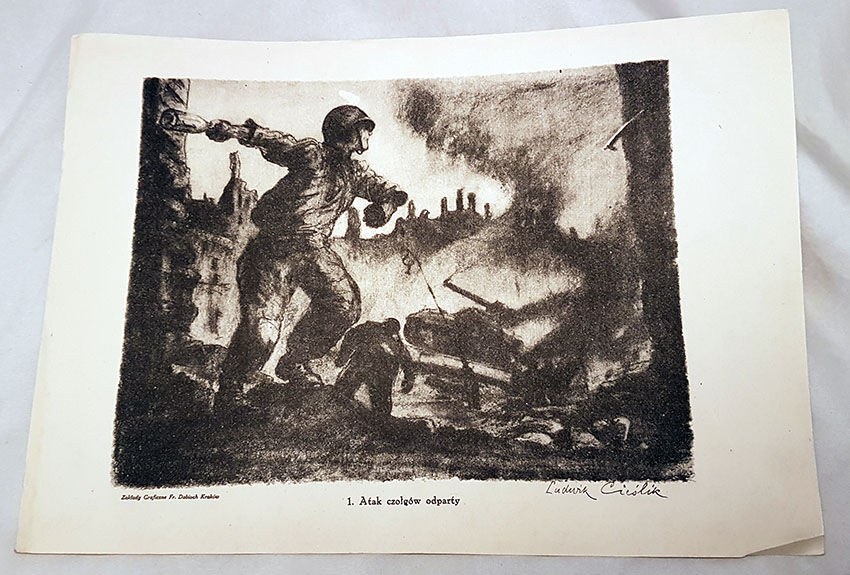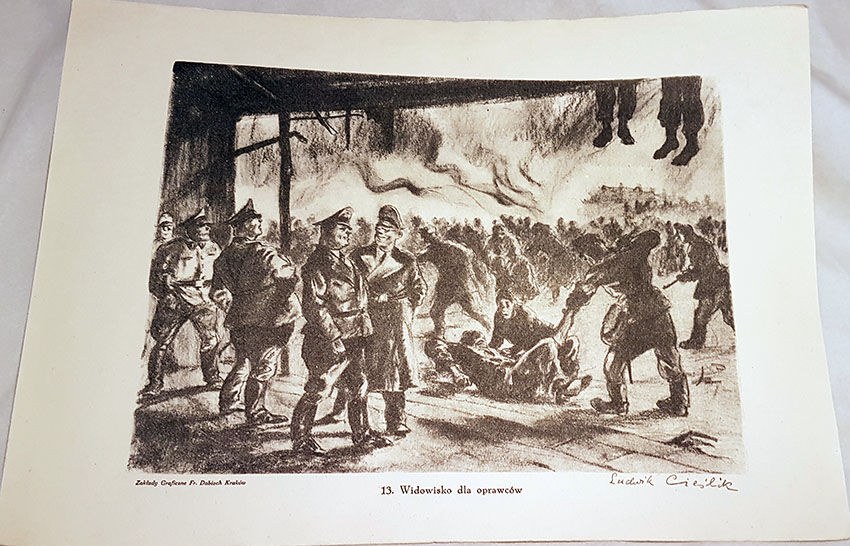 Na tablicach reprodukcje rysunków ukazujących walki powstańcze, życie stolicy w dniach powstania warszawskiego, wywózkę mieszkańców do obozu w Pruszkowie, warunki życia obozowego.