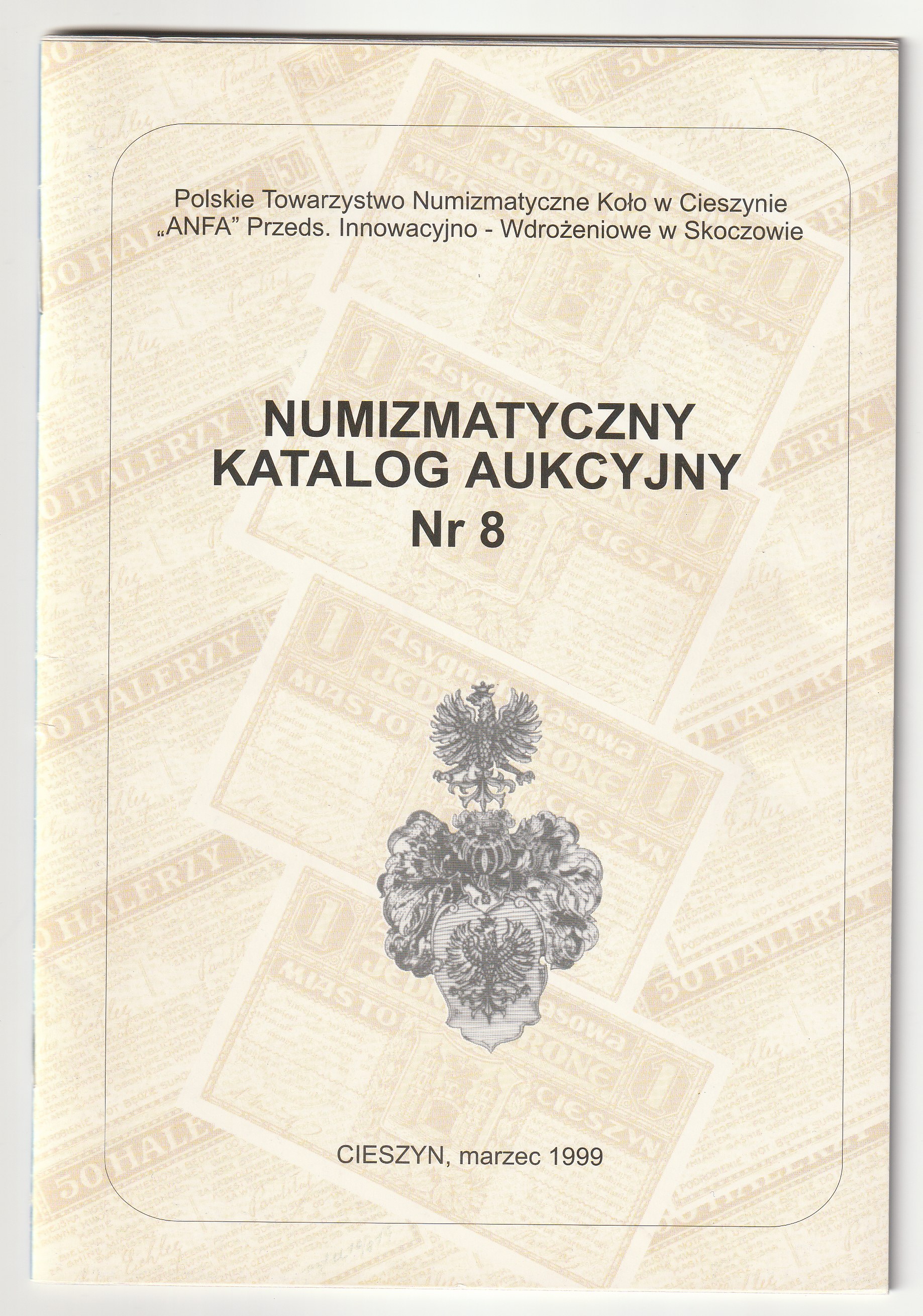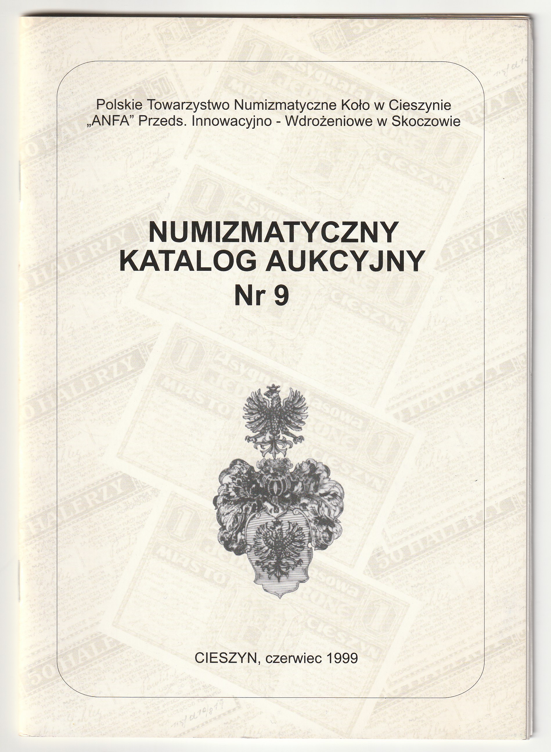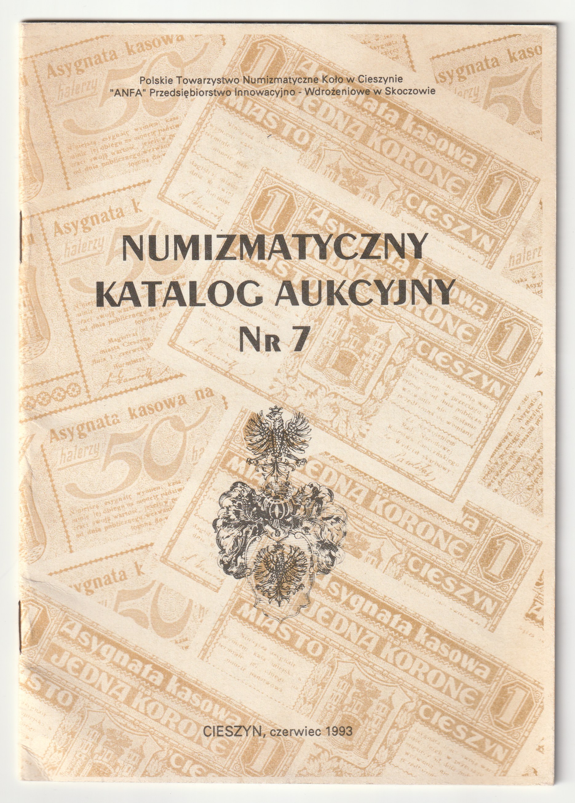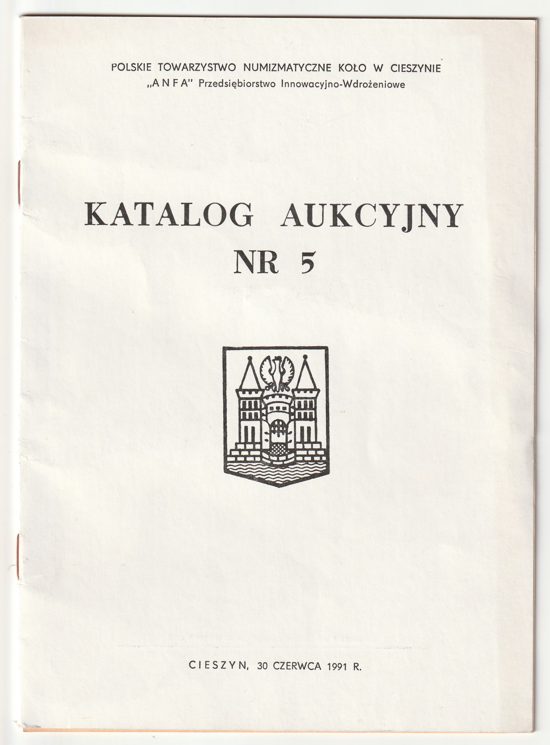 CIESZYN. : Katalogi, oprawa miękka, w większości st. bdb., wym. ok. 145x200, 145x210 mm: 1) Katalog Aukcyjny Nr 4, wyd. PTAiN, Cieszyn 1989, str. 16, st. db.; 2) Katalog Aukcyjny Nr 5, wyd. PTN, Cieszyn 1991, str. 20; 3) Numizmatyczny Katalog Aukcyjny, wyd. PTN, Cieszyn 1992, str. 20; 4) Numizmatyczny Katalog Aukcyjny nr 7, wyd. PTN, Cieszyn 1993, str. 22; 5) Numizmatyczny Katalog Aukcyjny nr 8, wyd. PTN, Cieszyn 1999, str. 25; 6) Numizmatyczny Katalog Aukcyjny nr 9, wyd. PTN, Cieszyn 1999, str. 31.
