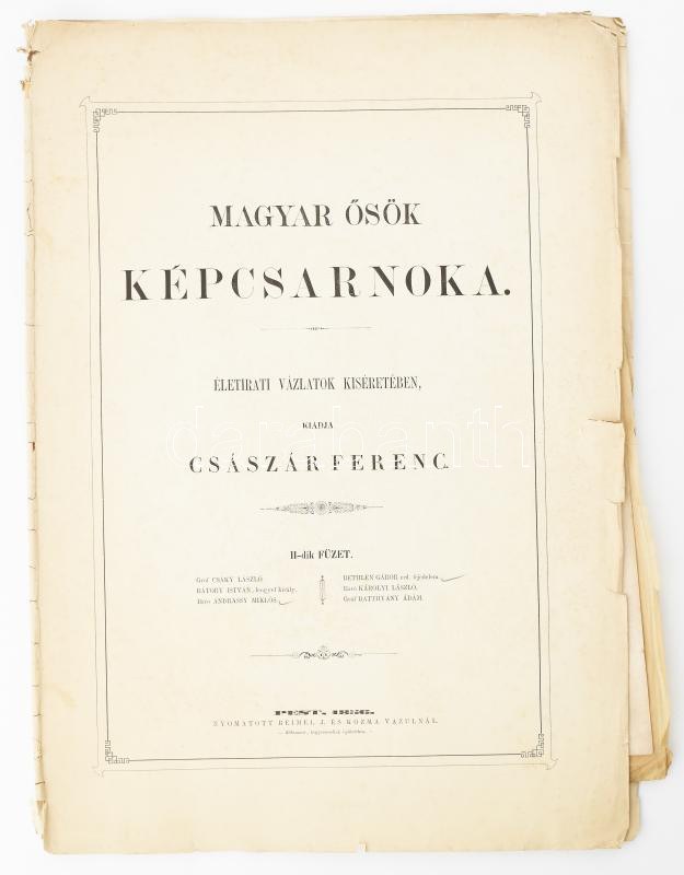 Császár Ferencz. Magyar ösök képcsarnoka. Életirati vázlatok kiséretében. II.-ik füz. Pest, 1856. Ny. Beimel J. és Kozma Vazul.6 l + 2 t ((a hatból, nagy méretű litográfiák) báró Andrásy Miklós Gömör megye Főispánja; Bethlen Gábor erdélyi fejedelem. 40x55 cm Lapok szélén beszakadásokkal