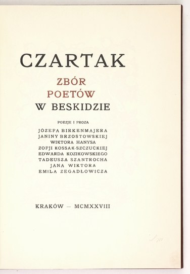 CZARTAK. Zbór poetów w Beskidzie. [Nr 3]. Poezje i proza Józefa Birkenmajera, Janiny Brzostowskiej, Wiktora Hanysa, Zofji Kossak-Szczuckiej, Edwarda Kozikowskiego, Tadeusza Szantrocha, Jana Wiktora, Emila Zegadłowicza. Kraków 1928. Druk. "Czasu". 4, s. 217, [1], tabl. 8. opr. wsp. pł. z zach. okł. brosz.