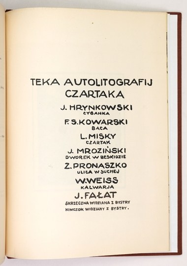 Grońska 29. Reperowane ubytki i naddarcia okł. brosz., poza tym stan bardzo dobry. Trzeci i ostatni numer pisma literackiego środowiska Czartaka. Tablice odbite w autolitografiach - składają się na "Tekę autolitografij Czartaka", zaw. prace: Juliana Fałata ("Skrzeczna widziana z Bystrej"; "Widok z Bystrej na Klimczok"), Jana Hrynkowskiego ("Cyganka"), Felicjana Szczęsnego Kowarskiego ("Baca"), Ludwika Misky'ego ("Czartak"), Tytusa Czyżewskiego ("Dom Zegadłowicza w Gorzeniu" - mylnie oznaczony w spisie jako litografia Jana Mrozińskiego "Dworek w Beskidzie"), Zbigniewa Pronaszki ("Ulica w Suchej"), Wojciecha Weissa ("Kalwarja"). W ramach paginacji całostronicowe drzeworyty Zdzisława Gedliczki ("Jablonka"), Ludwika Misky'ego (3 szt. - do "Jałowcarza" E. Zegadłowicza: "Jałowcarz przy drzewku", "Pejzaż", "Na wędrówce") i Edwarda Porządkowskiego ("Poławiacze piasku") oraz reprodukcje rys. Zbigniewa Pronaszki (portrety i karykatury autorów).