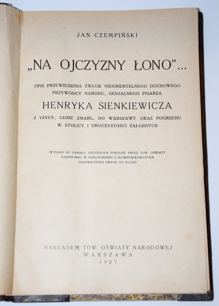 CZEMPIŃSKI Jan - "Na ojczyny łono"... Na Ojczyzny Łono, [sprowadzenie zwłok Henryka Sienkiewicza]. Warszawa 1927.
