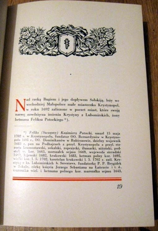 Monografia źródłowa poświęcona dziejom rodziny Potockich, szczególnie postaci Stanisława Szczęsnego założyciela tytułowego Krystynopola. Zawiera także skorowidz nazwisk i miejscowości oraz bibliografię Krystynopola i Potockich.