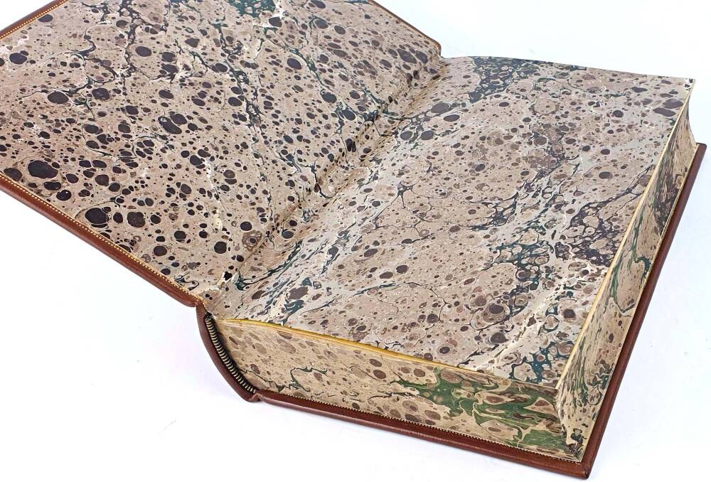 TWARDA OPRAWA PEŁNA SKÓRA WSPÓŁCZESNA. OKŁADKI OKOLONE ZŁOCONĄ BORDIURĄ, GRZBIET Z WYPUKŁYMI ZWIĘZAMI, TŁOCZENIAMI Z ZŁOCENIAMI. RĘCZNIE BARWIONY W MASIE PAPIER MARMORYZOWANY NA WYKLEJKACH, WSZYSTKIE OBCIĘCIA KART BARWIONE. WNĘTRZA OKŁADEK WYKOŃCZONE MISTERNYM TŁOCZONYM ZŁOTEM SZLACZKIEM. ZACHOWANA PRZEDNIA OKŁADKA KARTONOWA WYDAWNICZA