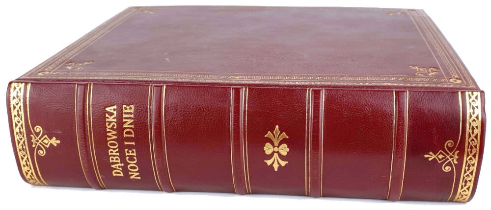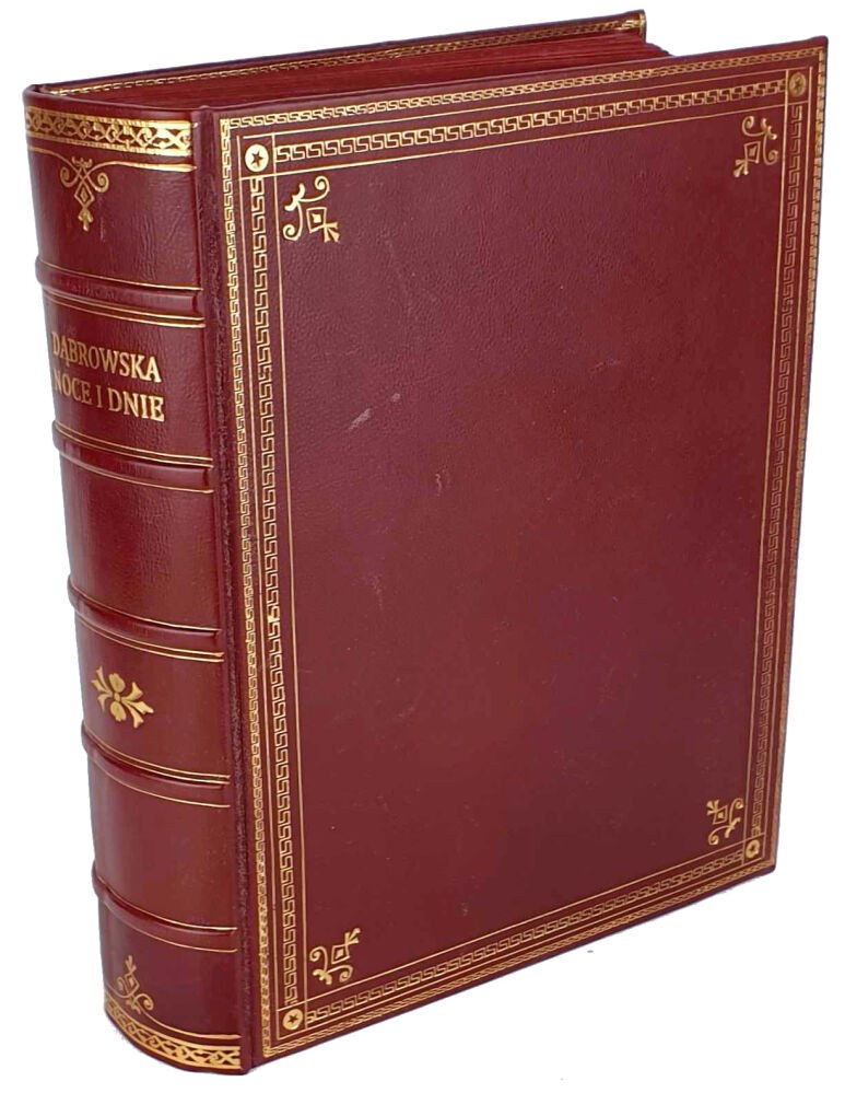 TWARDA OPRAWA PEŁNA SKÓRA WSPÓŁCZESNA, BOGATE ZDOBIENIA OKŁADEK, GRZBIET Z WYPUKŁYMI ZWIĘZAMI I ZŁOCENIAMI, OBCIĘCIA KART BARWIONE, WYKLEJKI Z RĘCZNIE BARWIONEGO W MASIE MARMORYZOWANEGO PAPIERU OZDOBNEGO.