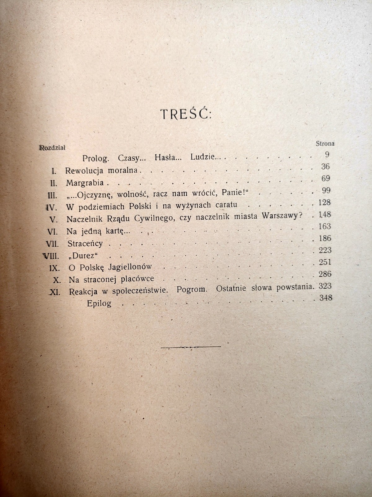 Zawiera m.in.: Rewolucja moralna; W podziemiach Polski i na wyżynach caratu; Na jedną kartę...; O Polskę Jagiellonów; Na straconej placówce.