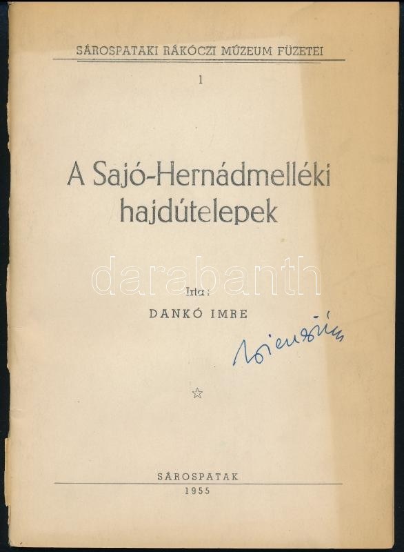 Dankó Imre: A Sajó-Hernádmelléki hajdútelepek. Sárospataki Rákóczi Múzeum Füzetei. 1. Sárospatak, 1955, Rákóczi Múzeum, 40 p. Első kiadás. Kiadói papírkötés. Megjelent 1600 példányban. Dankó Imre (1922-2008) etnográfus, történész, múzeumigazgató által Dienes István (1929-1995) régész, muzeológus részére dedikált példány. Dienes István névbejegyzésével.