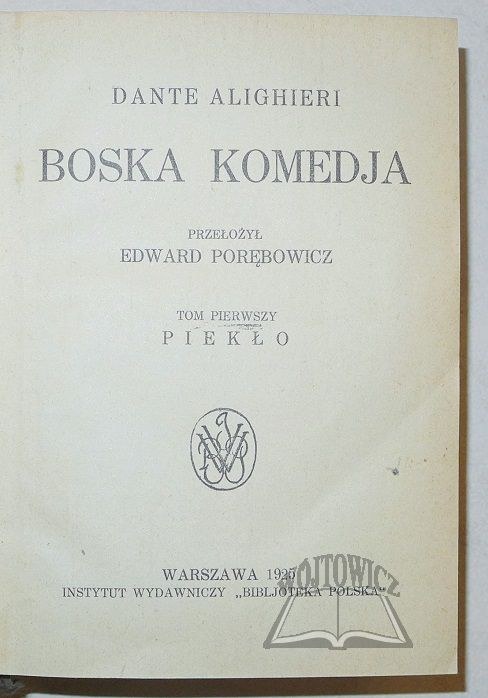 Boska Komedja. Tom 1-3 w 1 wol. Przełożył Edward Porębowicz. Warszawa 1925. Instytut Wydawniczy "Bibljoteka Polska". 8 (mała), s. [4], 283; [4], 262; [4], 256, współoprawne, opr. płsk. z epoki.Niew. o...