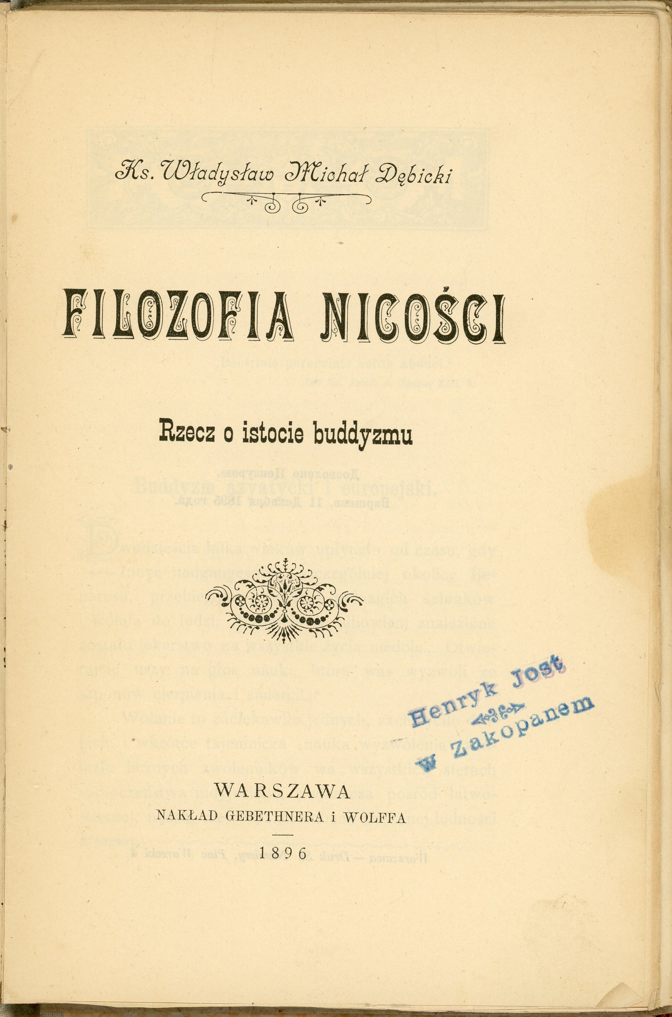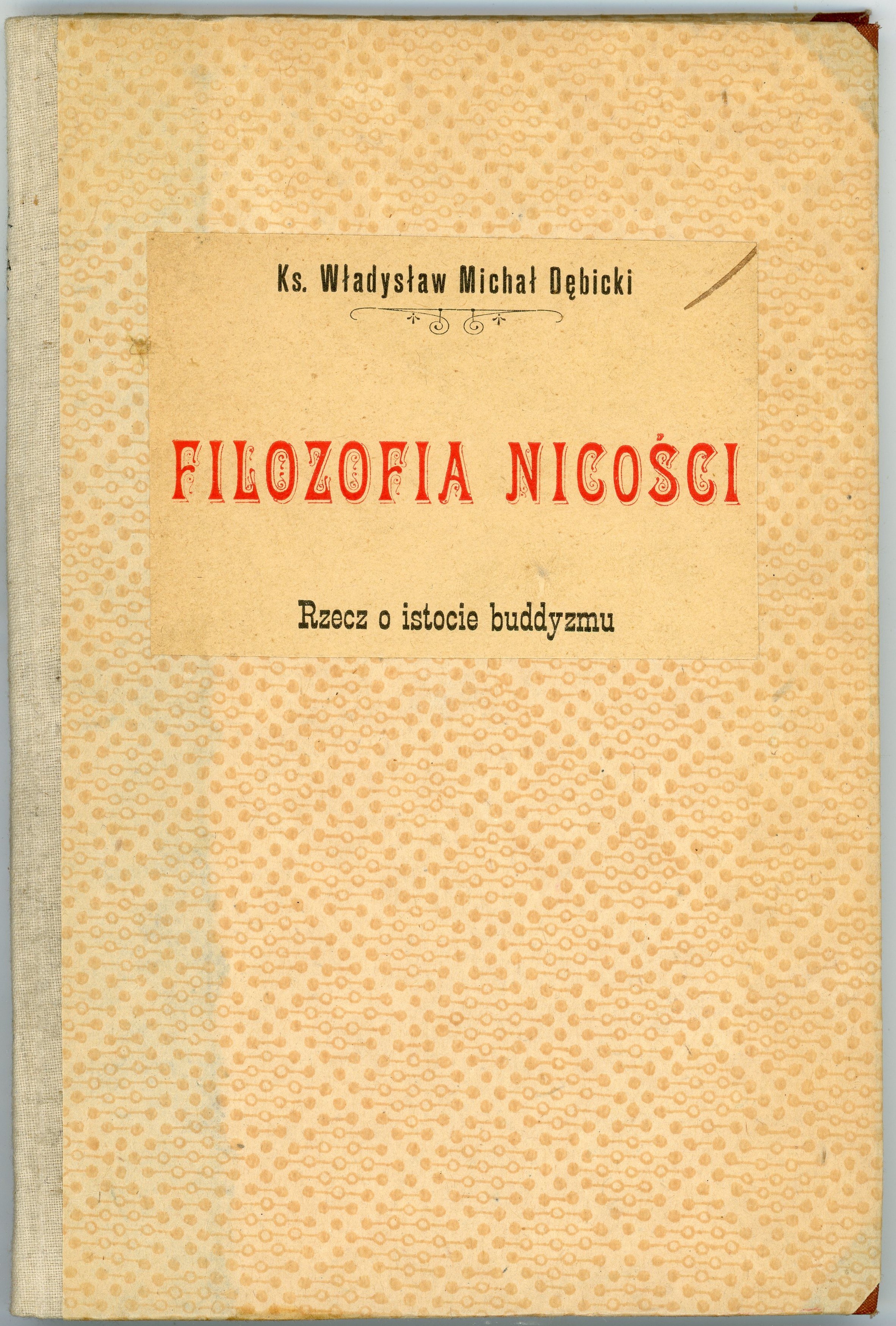 8, s. 108, [1], opr. wtórna z naklejonym fragmentem okł. oryg., na str. tytuł. pieczęć własnościowa, poluzowany blok. Treść: Buddyzm azyatycki i europejski. Stan Indii przed Buddą. Życie Buddy. Istota buddyzmu. Wartość metafizyczna i moralna buddyzmu.