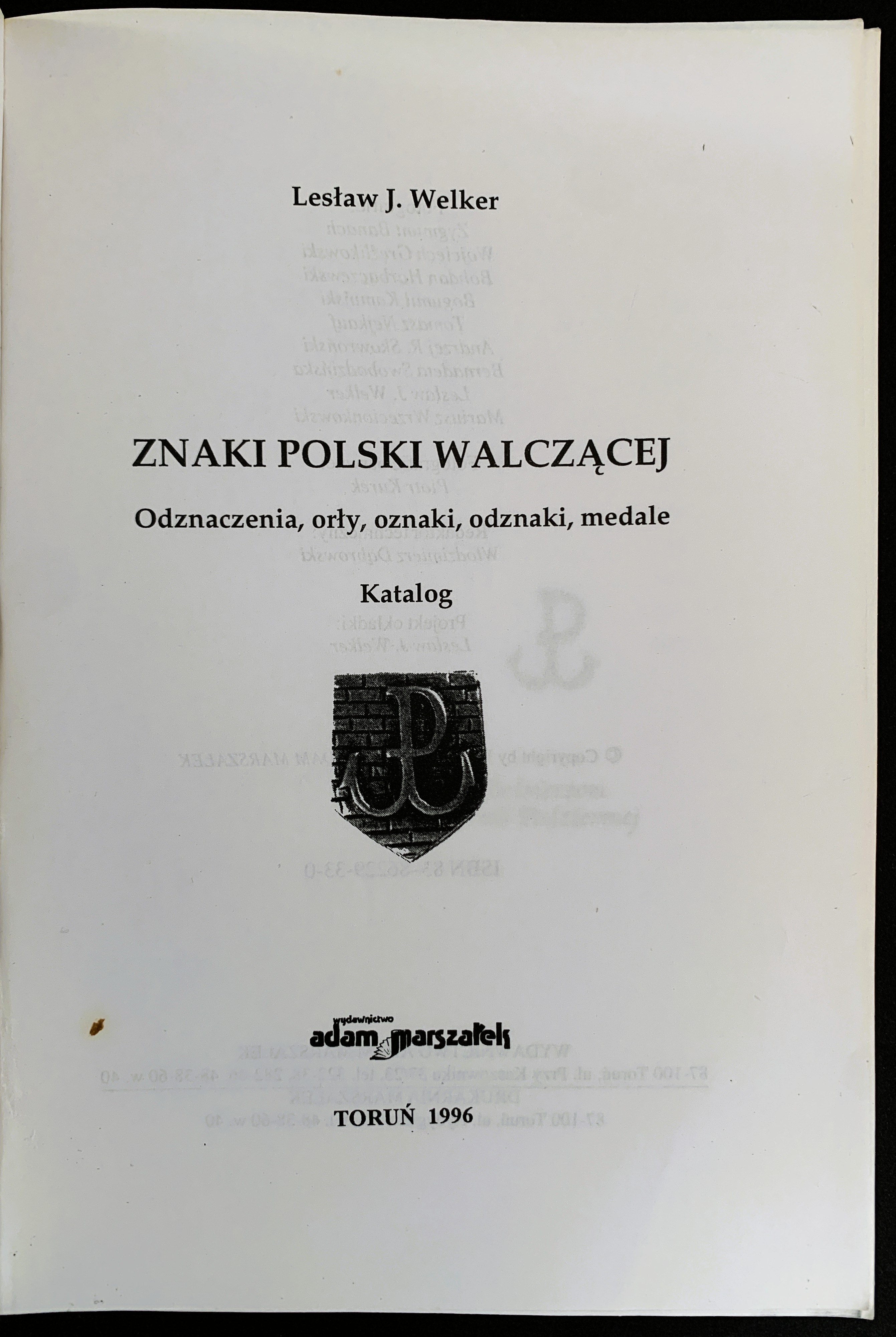 [Dedykacja] WELKER Lesław - Znaki Polski Walczącej. Toruń 1996. Adam Marszałek.