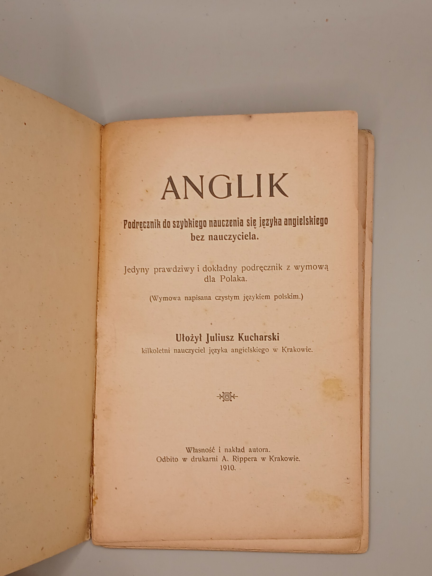 Juliusz Kucharski. Do Ameryki! Pierwszy Podręcznik podróżny dla Polaków potrzebujących języka angielskiego/ ANGLIK. Podręcznik do szybkiego nauczenia się języka angielskiego bez nauczyciela. Jedyny prawdziwy i dokładny podręcznik z wymową dla Polaka (Wymowa napisana czystym językiem polskim), ułożył Juliusz Kucharski kilkoletni nauczyciel języka angielskiego w Krakowie. Kraków 1910, nakładem autora. 17x11 cm. s. 55, wydawnicza okładka broszurowa, poluzowanie bloku książki.