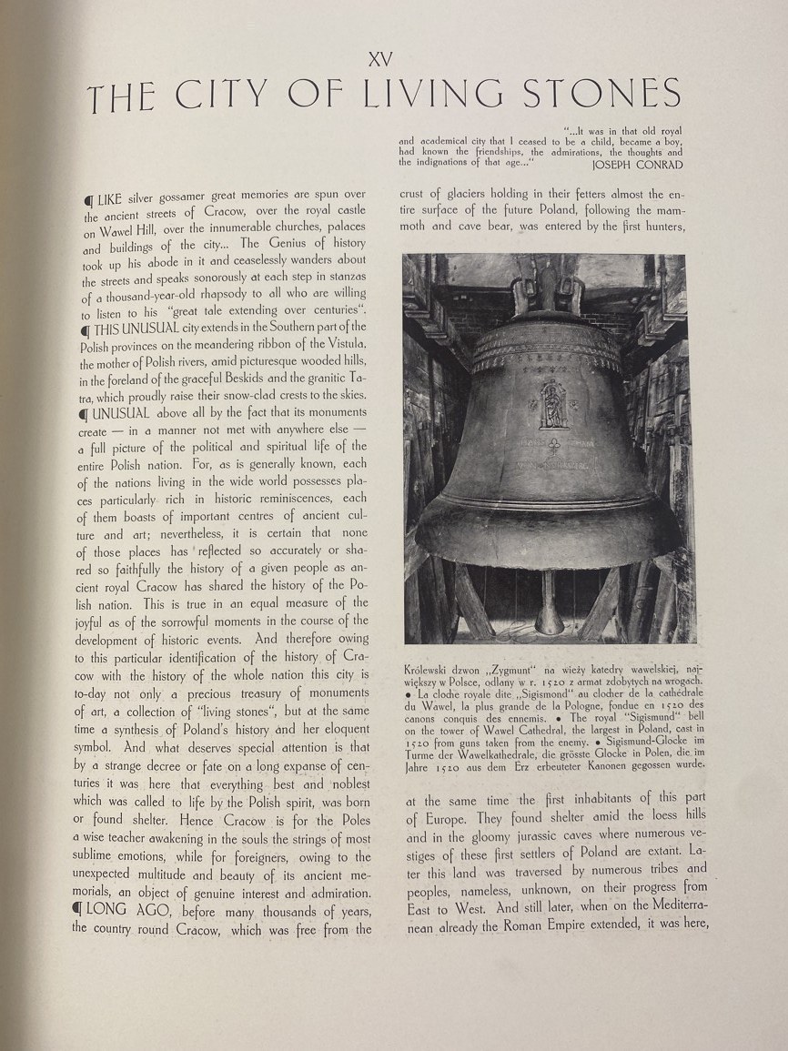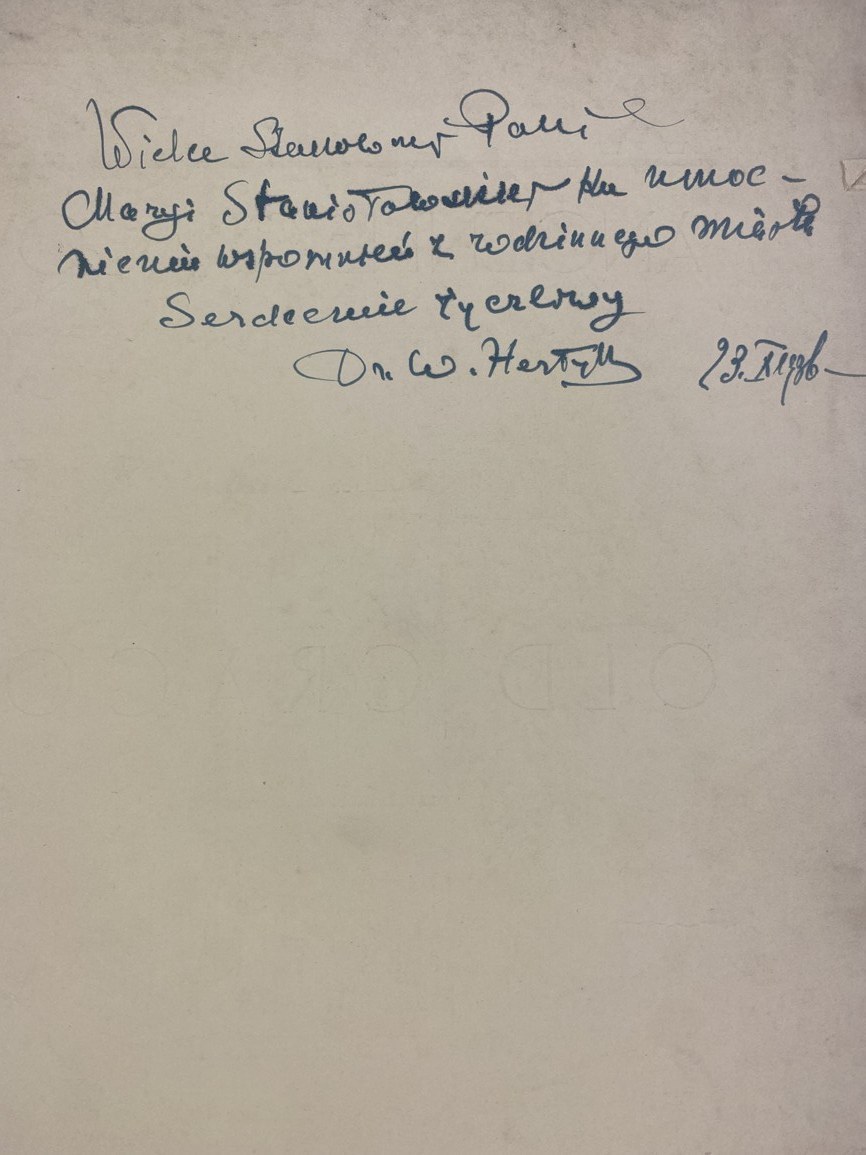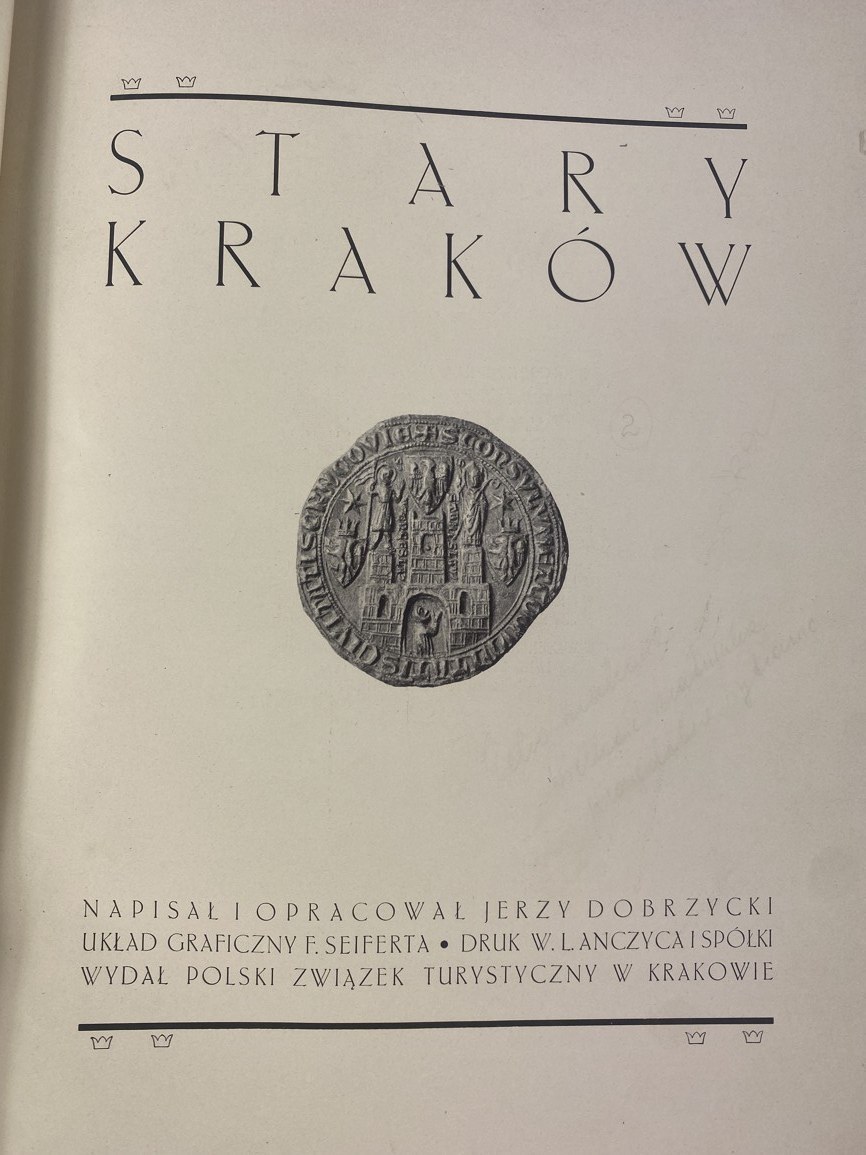 Dobrzycki Jerzy, Stary Kraków, układ graficzny Franciszek Seiferta, Druk W. L. Anczyca i Spółki, Wydał Polski Związek Turystyczny w Krakowie, Kraków 1936, s. 96, wymiary 24 x 32 cm. Dedykacja na stronie tytułowej. Elegancka oprawa półskórzana współczesna, wykonana ręcznie w pracowni Suszek Books. Zachowana okładka wydawnicza.