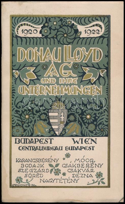 Donau Lloyd Aktiengesellschaft und ihre Unternehmungen. 1920-1922. Bp.-Wien, 1922., Centralbureau Budapest, (L. & F. Weiss-ny.), 23+1 p. Német nyelven. Fekete-fehér illusztrációkkal. Kiadói szecessziós illusztrált papírkötés, litografált (jelzett a nyomaton: Teuchert 922), elülső borítóval, foltos.