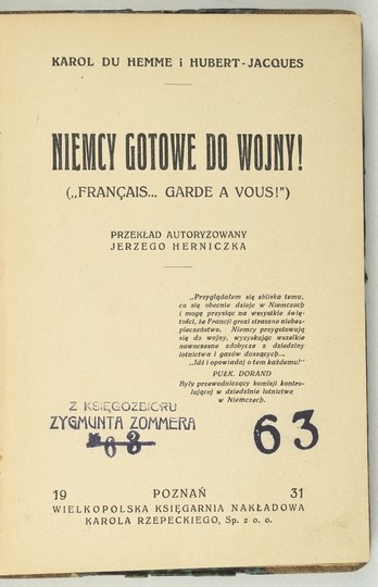 DU HEMME Karol, JACQUES Hubert - Niemcy gotowe do wojny! ("(Français... garde à vous!"). Przekład autoryzowany J. Herniczka. Poznań 1931. Wielkopolska Księg. Nakładowa Karola Rzepeckiego. 16d, s. 240, mapa rozkł. 1. opr. bibliot. ppł. z epoki.