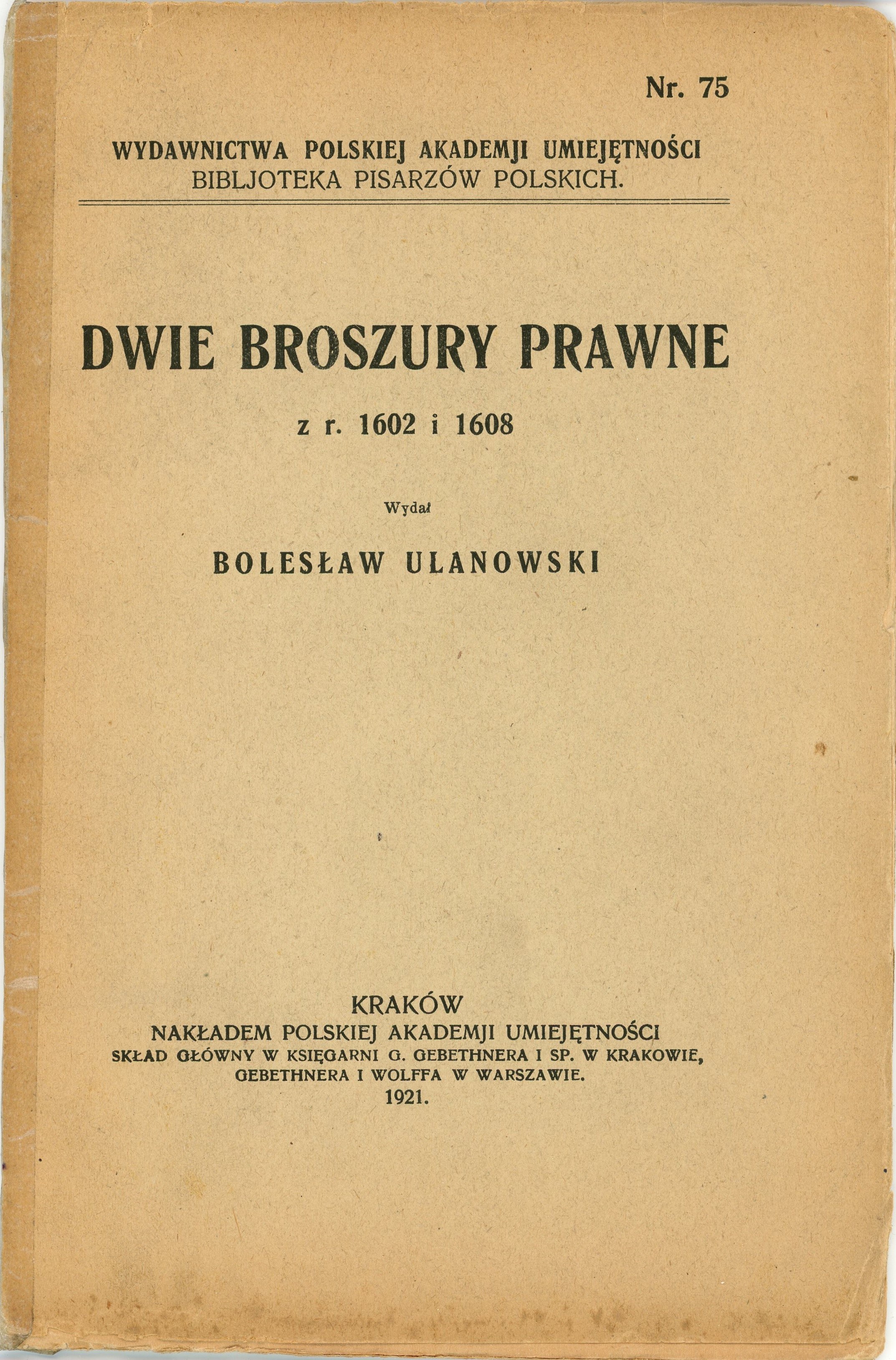 Dwie broszury prawne z r. 1602 i 1608 wydał Bolesław Ulanowski. Kraków 1921 Nakł. PAU.