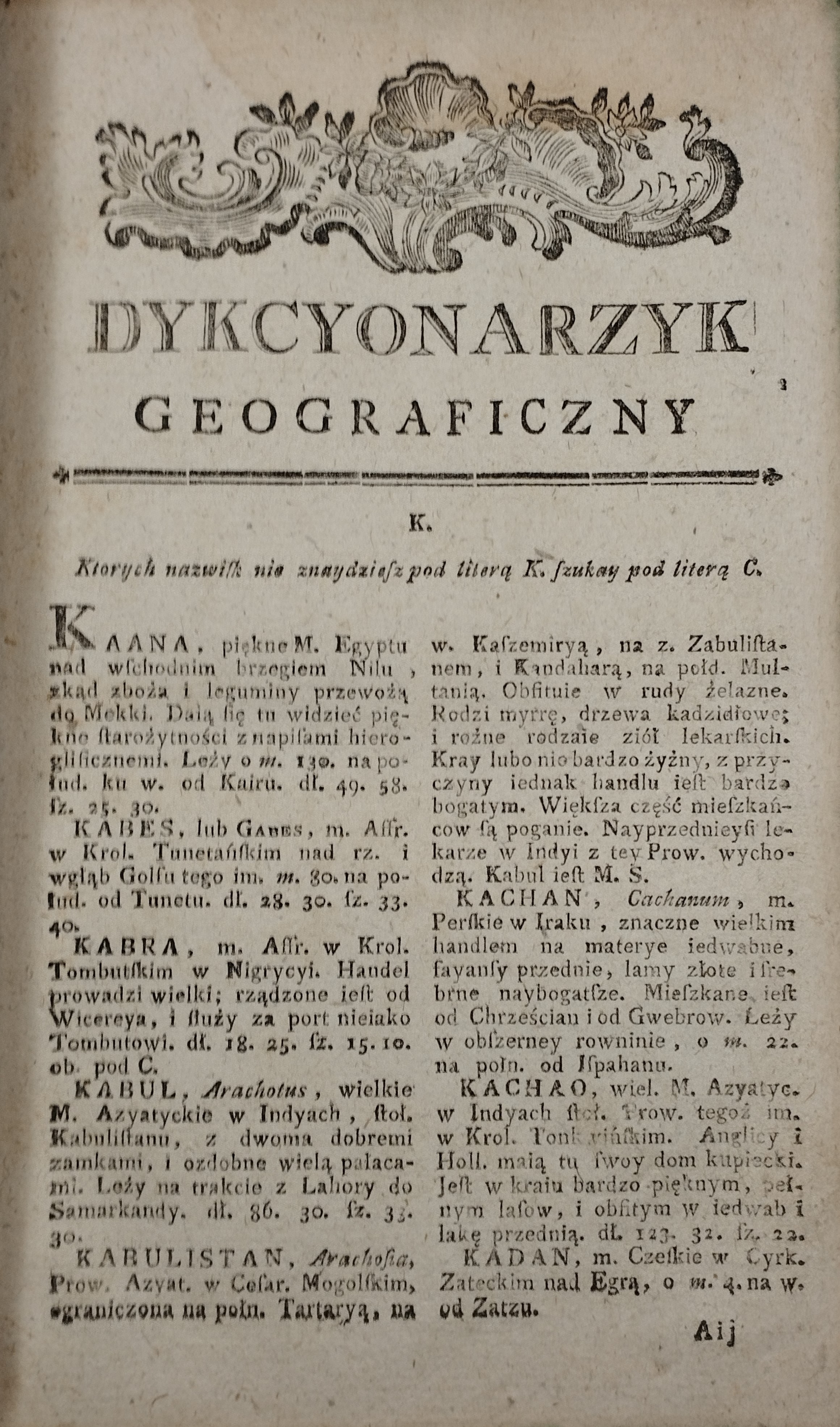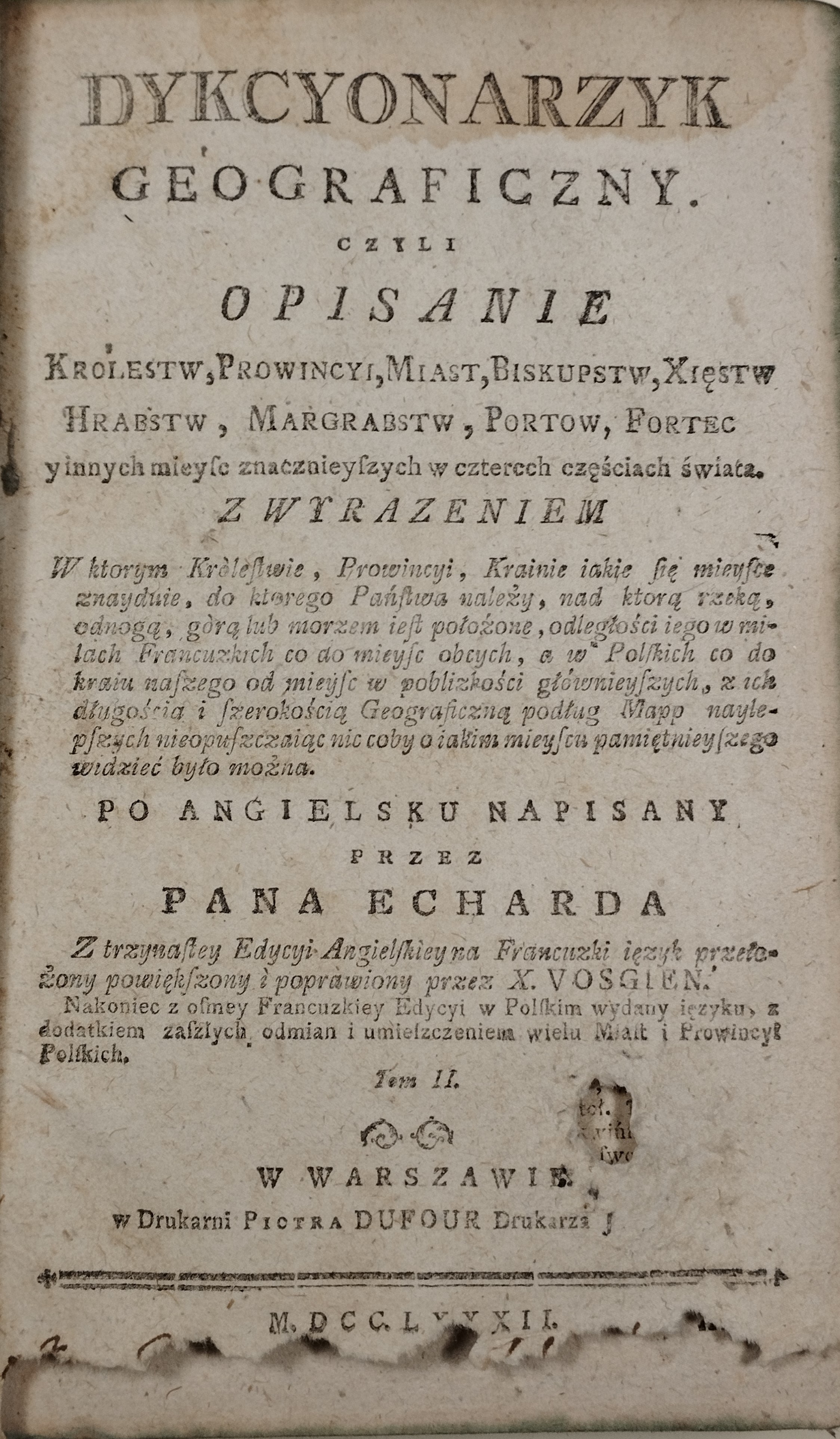 umieszczeniem wielu Miast i Prowincyi Polskich. T. II . Warszawa 1782 W Druk. Piotra Dufour Drukarza J.K.Mci. 8, s. 368, opr. sk. z epoki. Oprawa nieco przetarta, str. tytuł. z obciętym dolnym marginesem oraz małym ubytkiem papieru, poza tym stan dobry. T. 2 zawiera hasła : Kaana do Rzym. Tłumacz: Franciszek Siarczyński. E. XVI, 4,5.