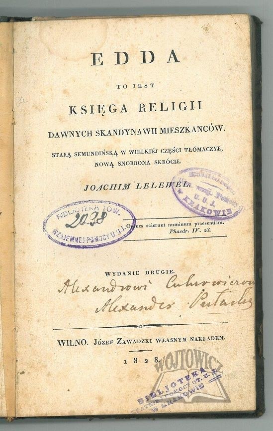 Starą Semundińską w wielkiej części tłómaczył, nową Snorrona skrócił Joachim Lelewel. Wyd. 2 (rozszerzone i poprawione). Wilno 1828. Józef Zawadzki własnym nakładem. 8, s. 226, 1 tabl. skład., okł. ppł. wtórna.