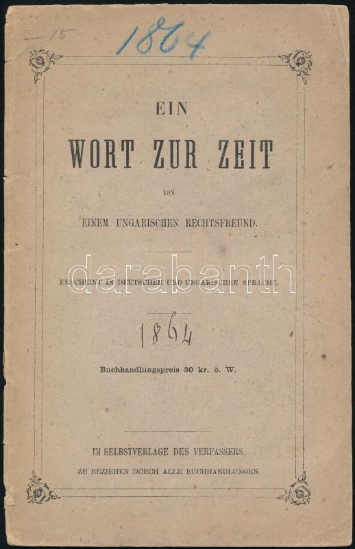 Ein Wort zur Zeit von einem ungarischen Rechtsfreund. Pressburg, 1864, Alois Schreiber, 20 p. Német nyelven. Kiadói papírkötés, szakadt borítóval, ceruzás aláhúzásokkal, bejelölésekkel. Benne "Dr. Ballagi Aladár" névbélyegzésével.