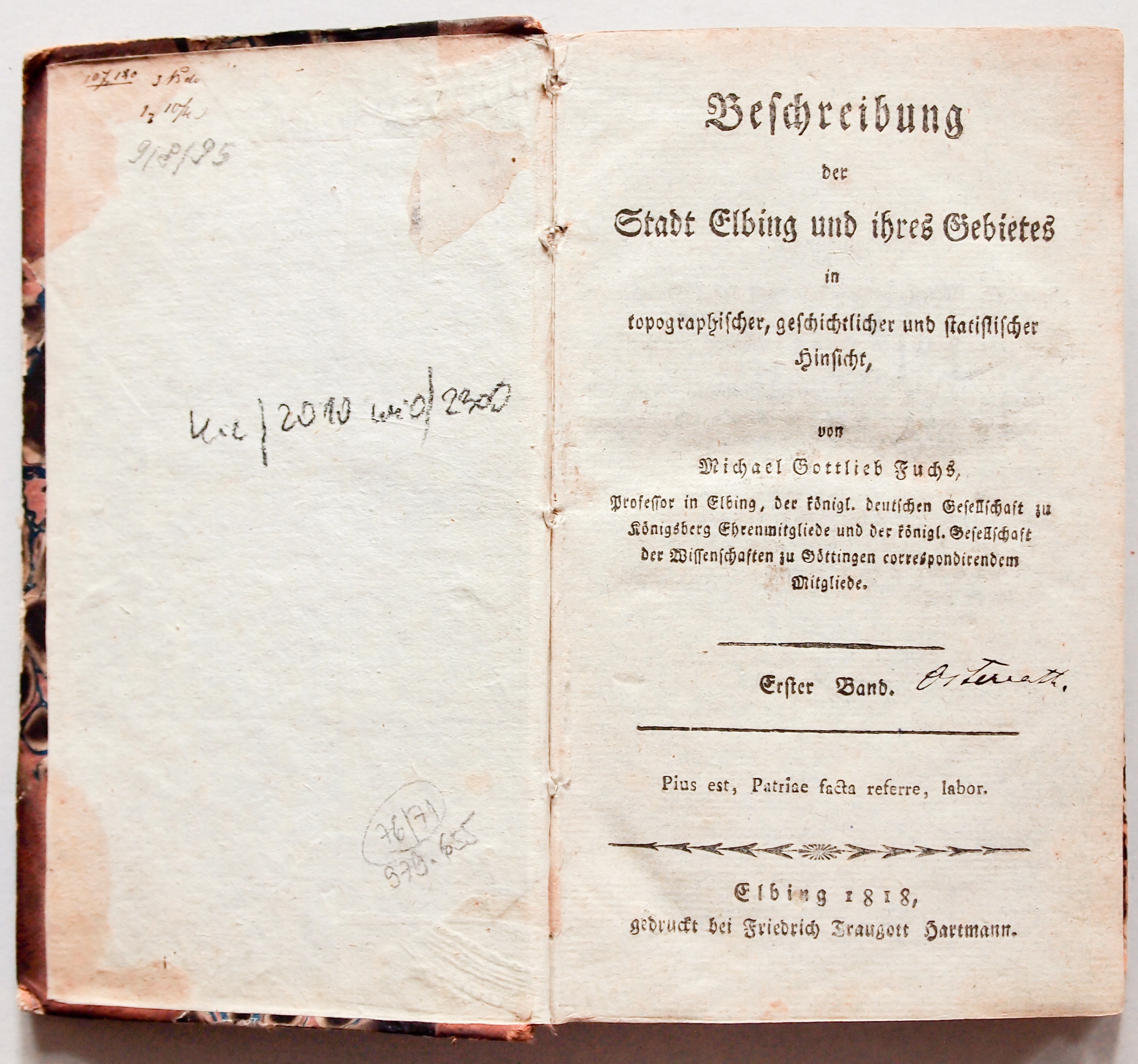 ELBLĄG. Fuchs, Michael Gottlieb, obszerna monografia Elbląga, t. I-III (tom III w 2 księgach), druk. F.T. Hartmann, Elbląg 1818-1827; na każdej str. tyt. odręczny podpis; 528 + 648 + 336 + 414 str., st. bdb., okładka twarda, grzbiet z szyldzikiem, przetarcia krawędzi; wymiary: ok. 100x175 mm; Beschreibung der Stadt Elbing und ihres Gebietes in topographischer, geschichtlicher und statistischer Hinsicht; BARDZO RZADKA I FUNDAMENTALNA PRACA DO HISTORII ELBLĄGA!