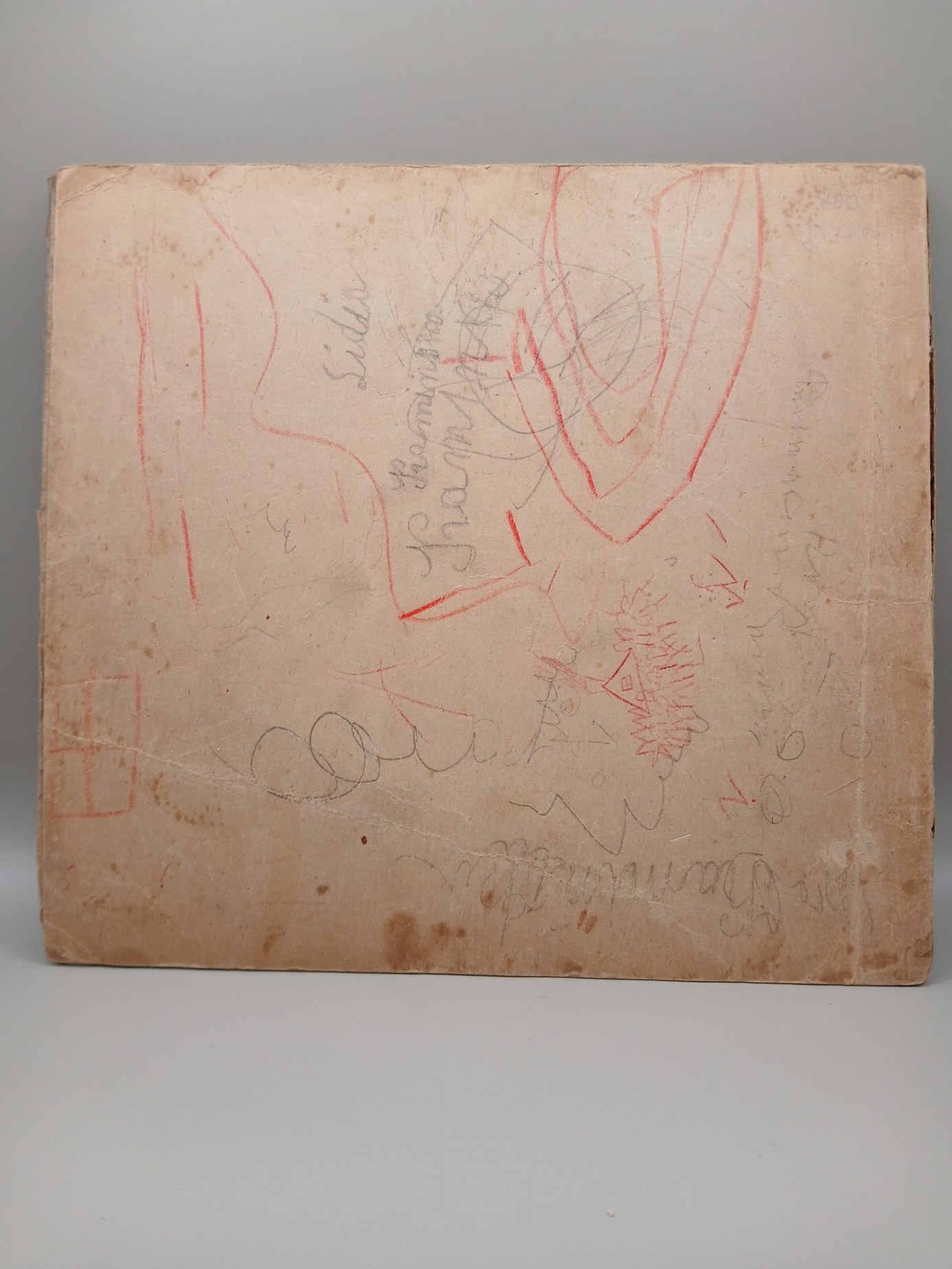 Książka na tylnej okładce porysowana kredkami, zamazane twarze na przedniej, zagięcia okładki, prawdopodobnie brak strony tytułowej.