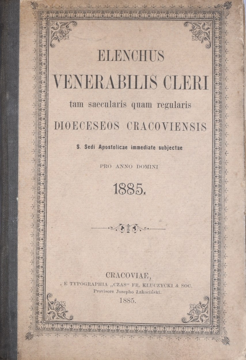 Tam Saecularis quam regularis Dioeceseos Cracoviensis S. Sedi Apostolicae immediate subjectae. Pro anno domini 1885. Cracoviae 1885 E Typographia Ephemeridum "Czas" Fr. Kulczycki. 16d, s. 299, [2], opr. pł. oryg., luzna.