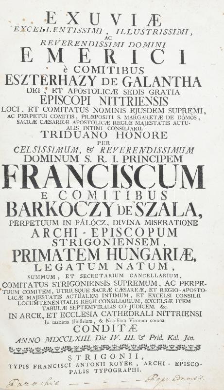 Exuviae ... Domini Emerici ? comitibus Eszterházy de Galantha ... episcopi Nittriensis ... Triduano honore per ... Franciscum e comitibus Barkoczy de Szala,... archi-episcopum Strigoniensem ... in arce,...et ecclesia cathedrali Nittriensi in maxima illustrium, & nobilium virorum corona conditae anno 1763. ... Benne még: Tapoltsányi Gergely: Három rendbéli hazánák bölts élő-járója jó és hív gondviselője. Melly nevezetek alatt... Galánthai gróff Eszterházy Imre ... Nyitra várában tartott pompás el-takarettatása alkalmatosságával ditsérő beszéddel meg-tiszteltetett....valamint más laudáló beszédek. Strigonii, (1763), typ. Franc. Ant. Royer. [140 ] l. 3 rézmetszetű címerrajzzal. Korabeli félbőr-kötésben. Nagyrészt magyar nyelven