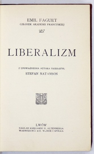 FAGUET Emil - Liberalizm. Z upoważnienia autora przełożył Stefan Natanson. Lwów [Od tłómacza 1909]. Księg H. Altenberga. 16d, s. XVI, 392. opr. psk. z epoki. Wiedza i Życie, Wyd. Związku Naukowo-Literackiego we Lwowie, Serya 3, t. 5.