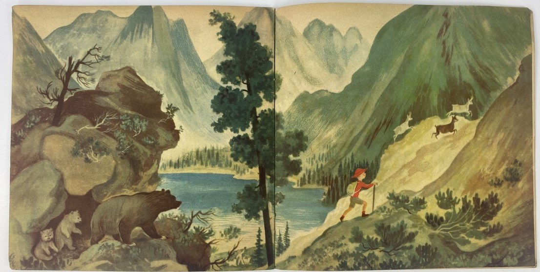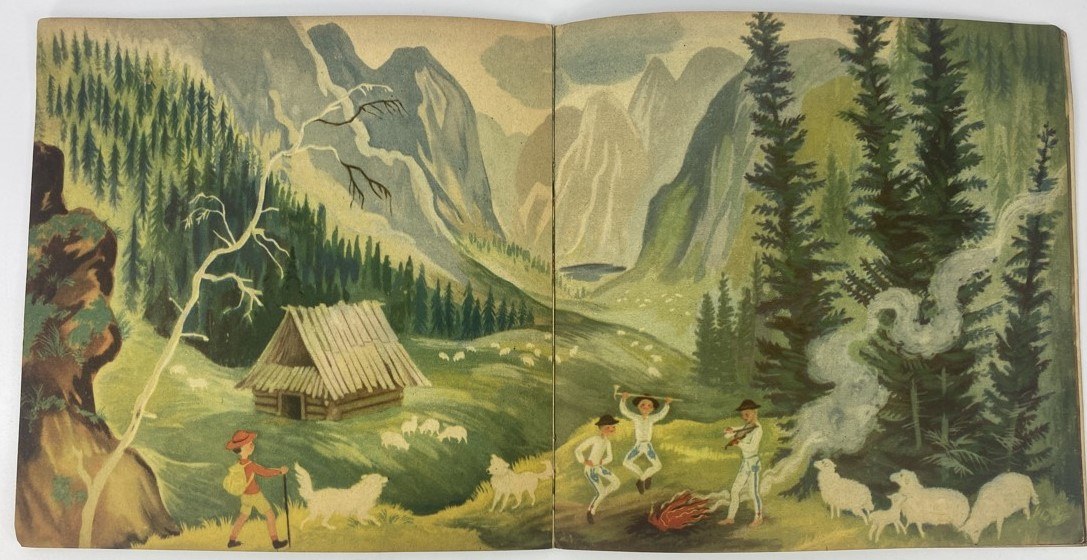 Fijałkowska Zofia, Góry, Instytut Wydawniczy "Nasza Księgarnia", Warszawa 1953, s. [12], wymiary 22 x 22 cm. Ilustracje Zofia Fijałkowska. Okładka broszurowa, wydawnicza. Niewielkie zabrudzenia, otarcia okładki. Zagięcia narożników.