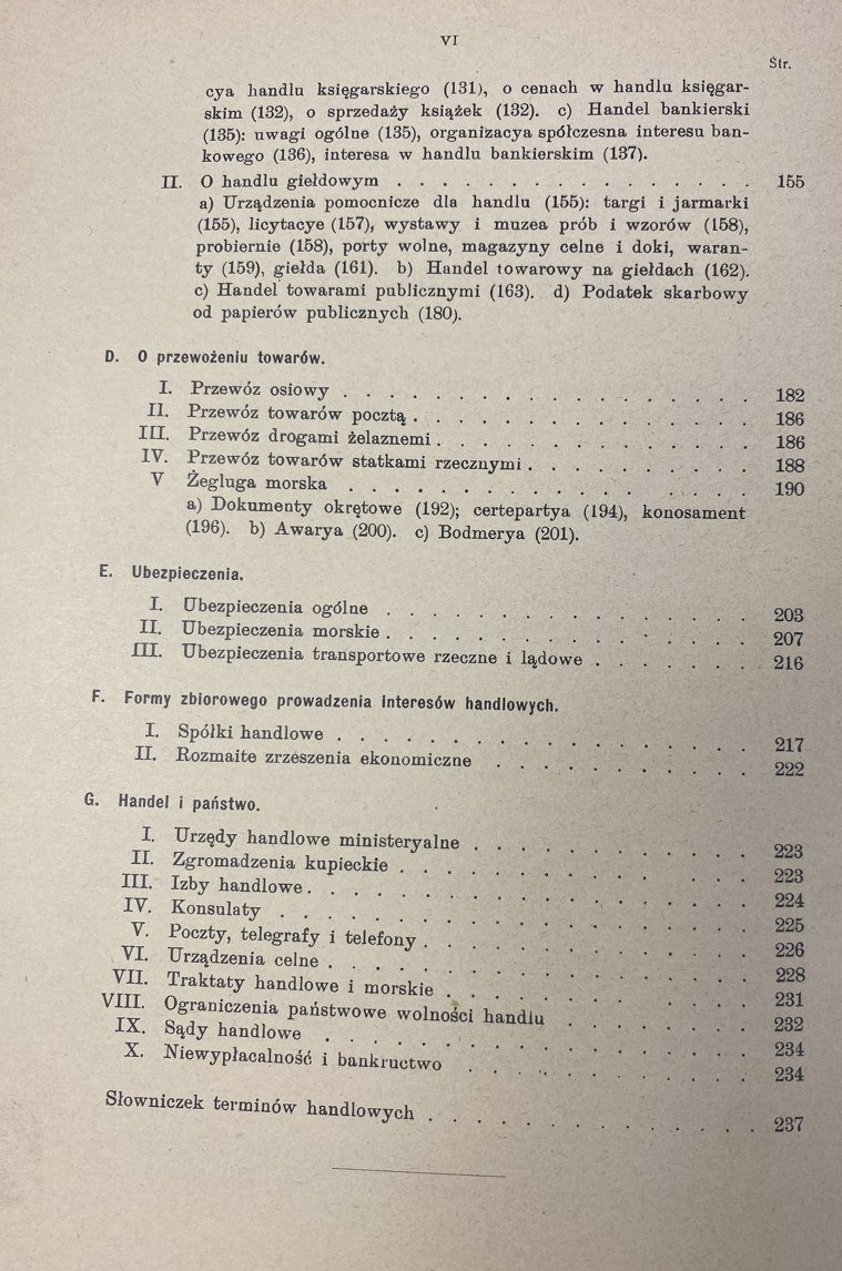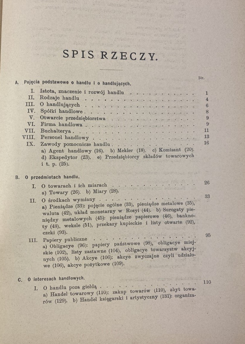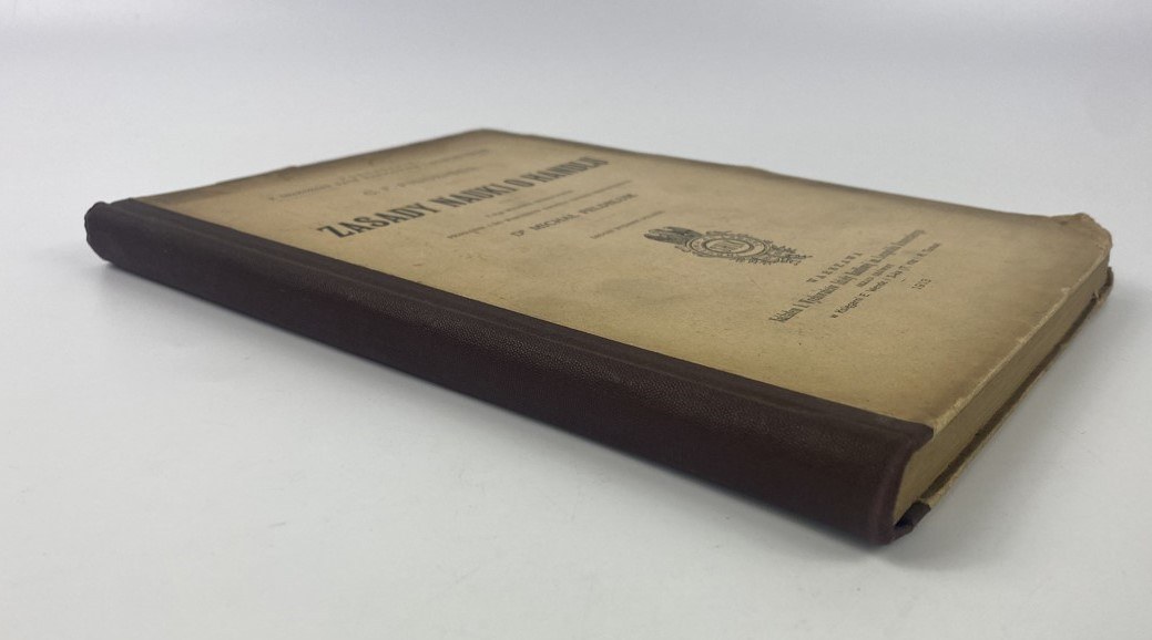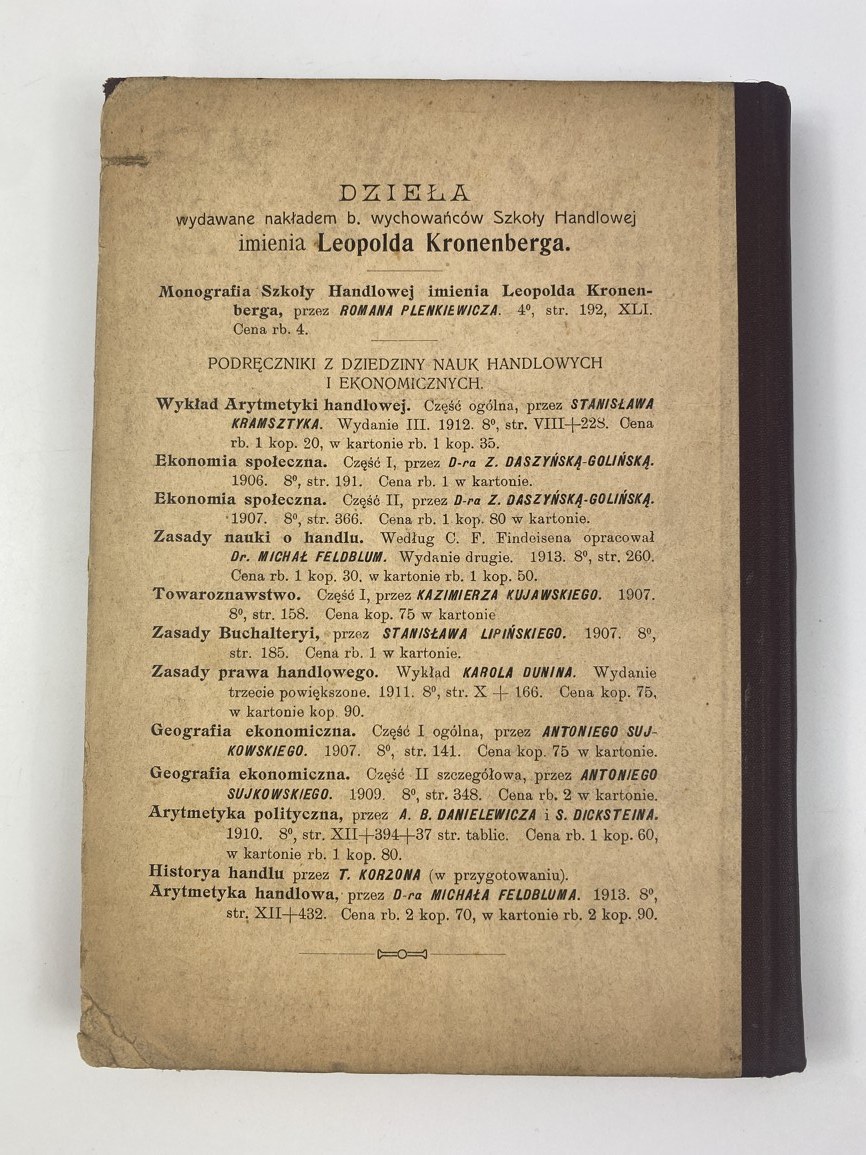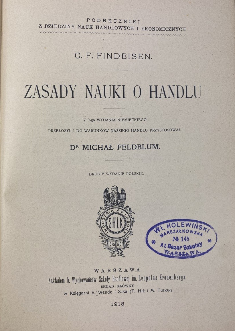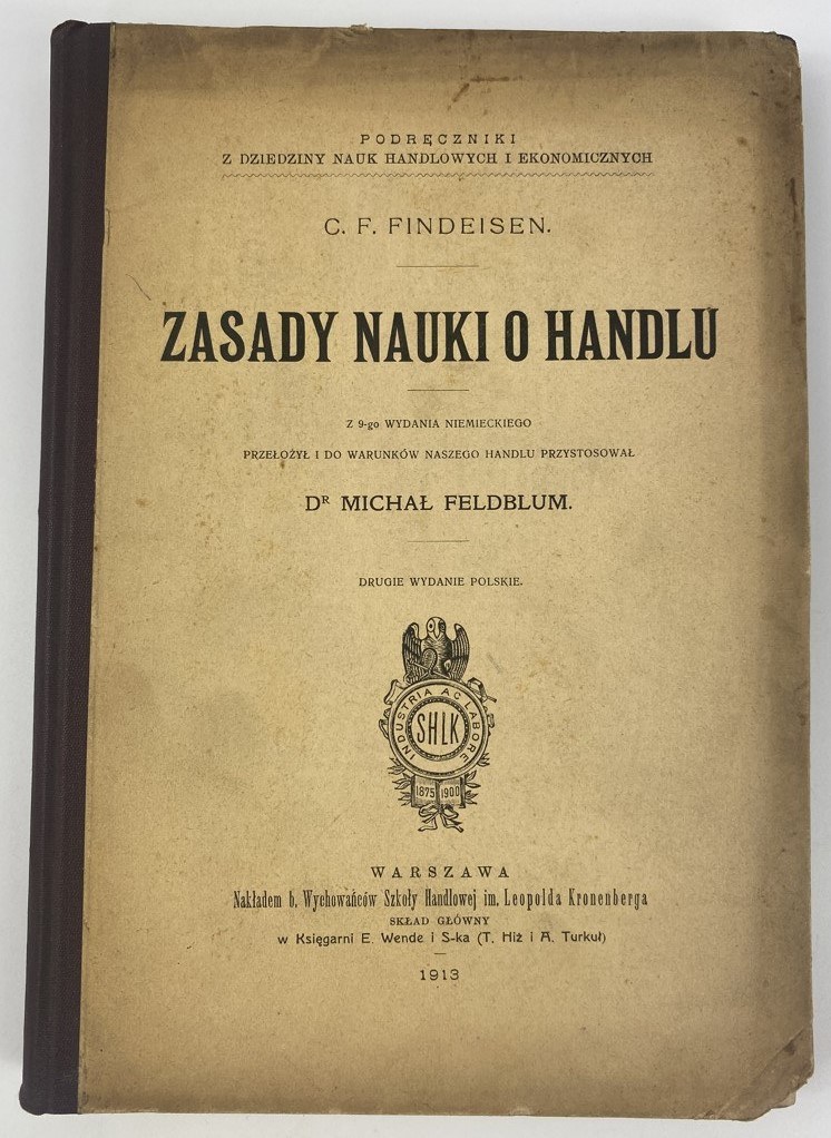 Findeisen C. F., Zasady nauki o handlu / C. F. Findeisen; z 9-go wydania niemieckiego przełożył i do warunków naszego handlu przystosował Michał Feldblum, nakł. b. Wychowańców Szkoły Handlowej im. Leopolda Kronenberga, Warszawa 1913, s. 259, wymiary 16,5 x 23,5 cm. Nieakt. pieczęć własności. Okładka półpłócienna, wydawnicza. Otarcia, zabrudzenia, niewielkie ubytki okładki.