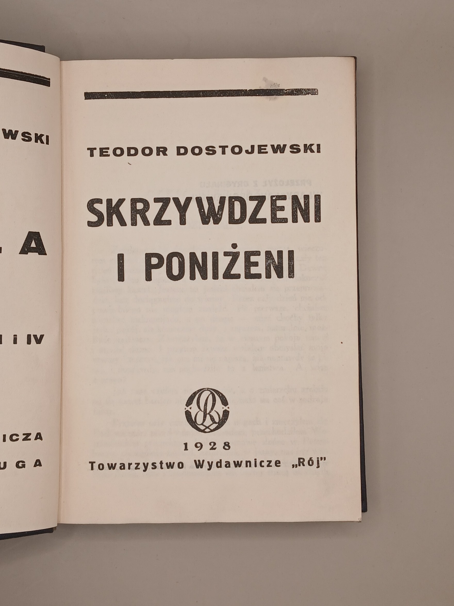 [FIODOR] TEODOR DOSTOJEWSKI. SKRZYWDZENI I PONIŻENI. WARSZAWA 1928. Towarzystwo Wydawnicze "Rój". Przełożył z oryginału Władysław Broniewski. 18,5x13 cm; s. 387