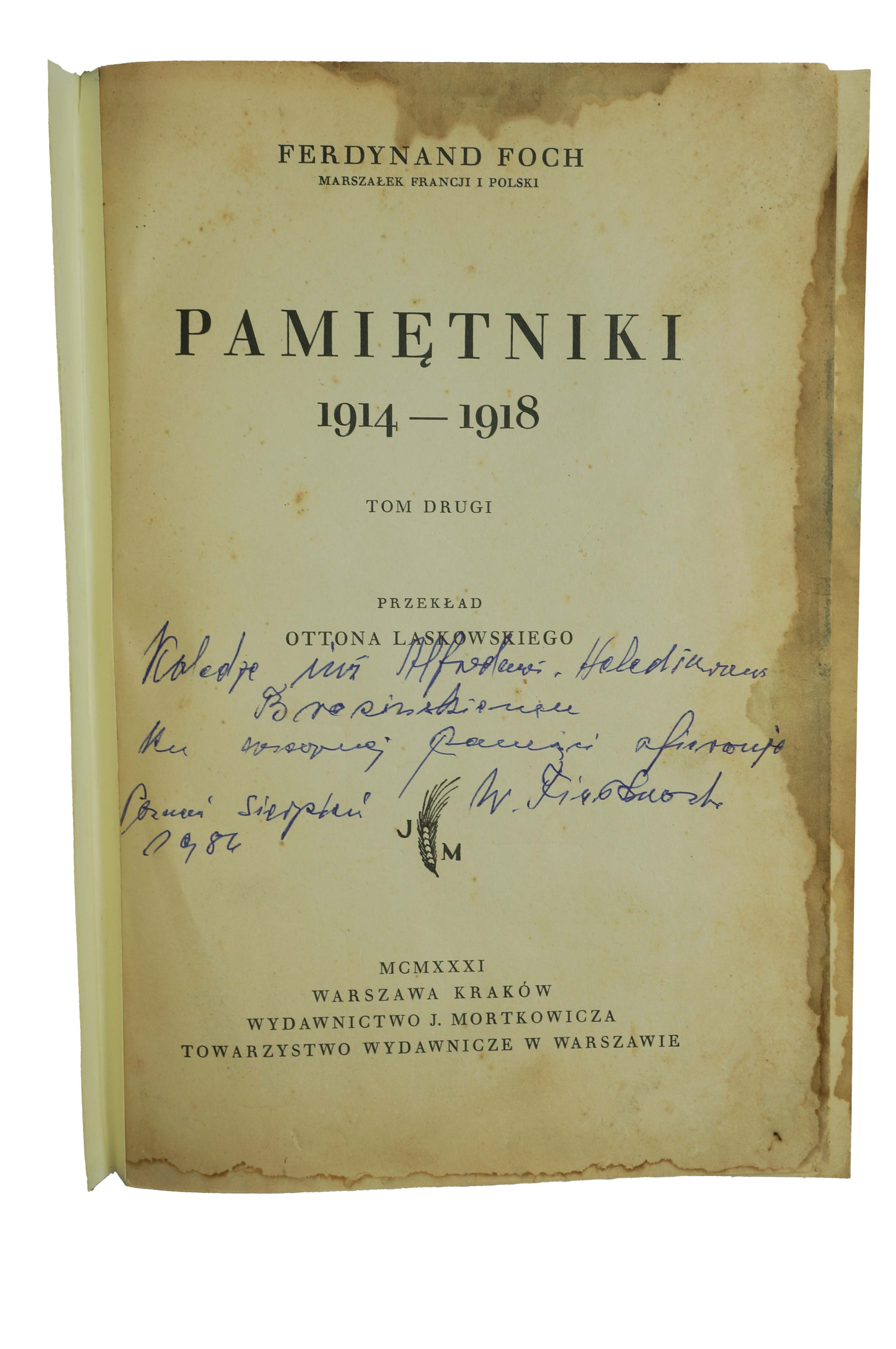 Pamiętniki , tom 2 - Ferdynand Foch, przekład Ottona Laskowskiego, Warszawa-Kraków 1931, Wydawnictwo J. Mortkowicza, Towarzystwo Wydawnicze w Warszawie, f. 16,5x23cm, s. 415