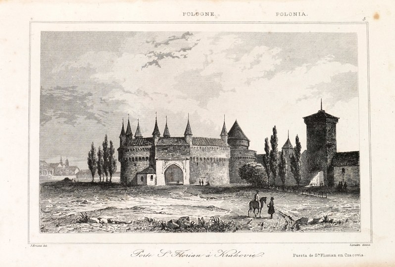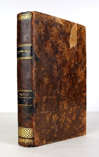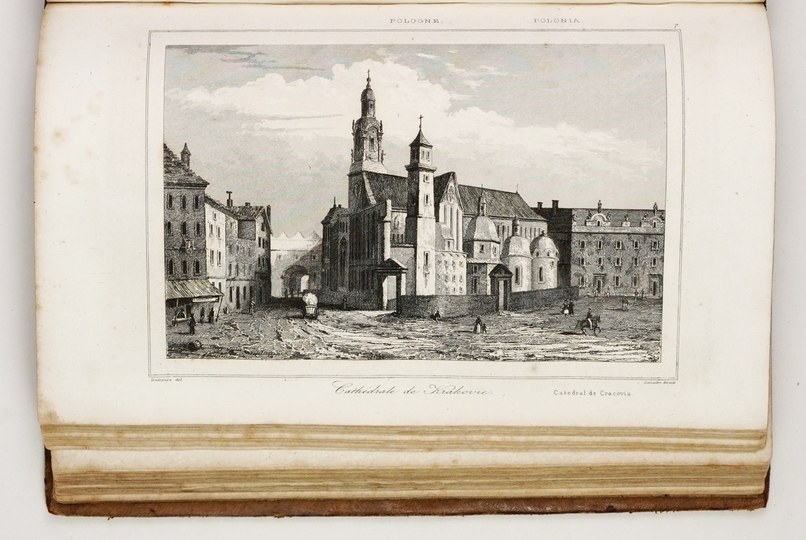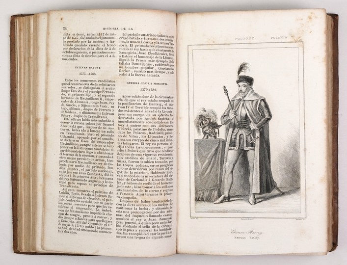 Opr. nieco otarta, blok lekko nadpęknięty, miejscami zaplamienia i zabrązowienia kart, stan ogólny dobry. Wyklejki marmoryzowane. Na tablicach staloryty, mapa: "Mapa general de Polonia. Carte générale de la Pologne" w miedziorycie. Kastylijska wersja francuskiej serii "L'Universe Pittoresque". Historia Polski doprowadzona do 1840 r. Staloryty wykonane identycznie jak we francuskiej wersji w pracowni Lemaitre przedstawiają widoki miast, pałaców, zabytków historycznych, portrety postaci historycznych, stroje ludowe.