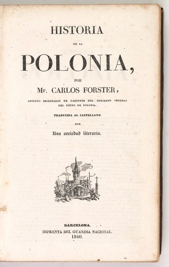 FORSTER Carlos - Historia de la Polonia, por ... Traducida al castellano por una Sociedad Literaria. Barcelona 1840. Imprenta del Guardia Nacional. 8, s. [4], 265, [3], tabl. 54, mapa rozkł. 1. opr. skóra złoc. z epoki. Panorama Universal.
