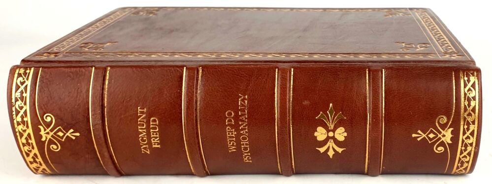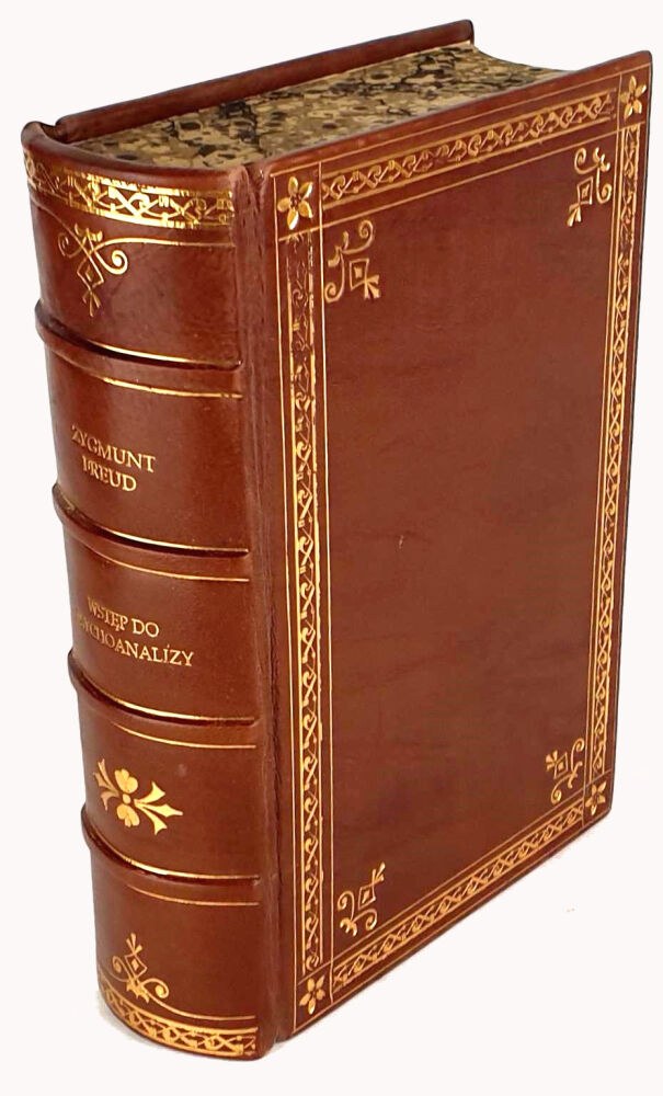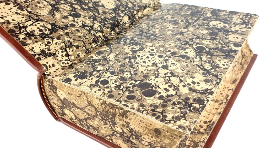 TWARDA OPRAWA PEŁNA SKÓRA WSPÓŁCZESNA OKŁADKI OKOLONE ZŁOCONĄ BORDIURĄ, GRZBIET Z WYPUKŁYMI ZWIĘZAMI, GŁĘBOKIMI TŁOCZENIAMI I ZŁOCENIAMI ORAZ DWOMA BARWNYMI SZYLDAMI. RĘCZNIE BARWIONY W MASIE PAPIER MARMORYZOWANY NA WYKLEJKACH, WSZYSTKIE OBCIĘCIA KART BARWIONE W TEN SAM SPOSÓB. WNĘTRZA OKŁADEK WYKOŃCZONE MISTERNYM TŁOCZONYM ZŁOTEM SZLACZKIEM.