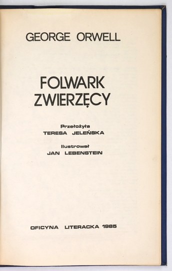 Federowicz 4142; Brzeski 3442. Załamania narożników okł., wewnątrz stan bardzo dobry. Bibliofilski druk podziemnej oficyny drukarskiej. Oprawa w kolorze ciemnoniebieskim. Świetne ilustracje Jana Lebensteina (1930-1999) są reprodukcjami litografii z teki "Animal Farm". Ilustracje naklejono na podkłady z czarnego grubego papieru. Jedno z pierwszych wydawnictw drugiego obiegu wyposażonych w barwne ilustracje.
