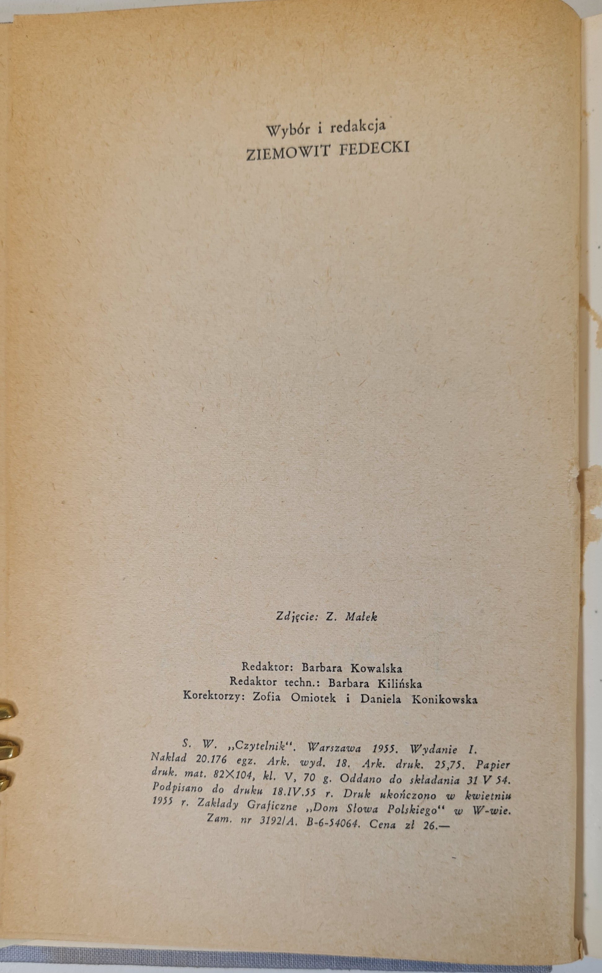 Ilustrował Henryk Tomaszewski. Wydawnictwo "Czytelnik", Warszawa 1955. Wydanie I. Wym. 19,7x13,5 cm ; stron 412. Oprawa płócienna w obwolucie (przybrudzenia, otarcia, przebarwienia obwoluty, zaciek na płóciennej oprawie), podpis własnościowy na stronie tytułowej, karty czyste, acz pożółknięte i przykurzone,