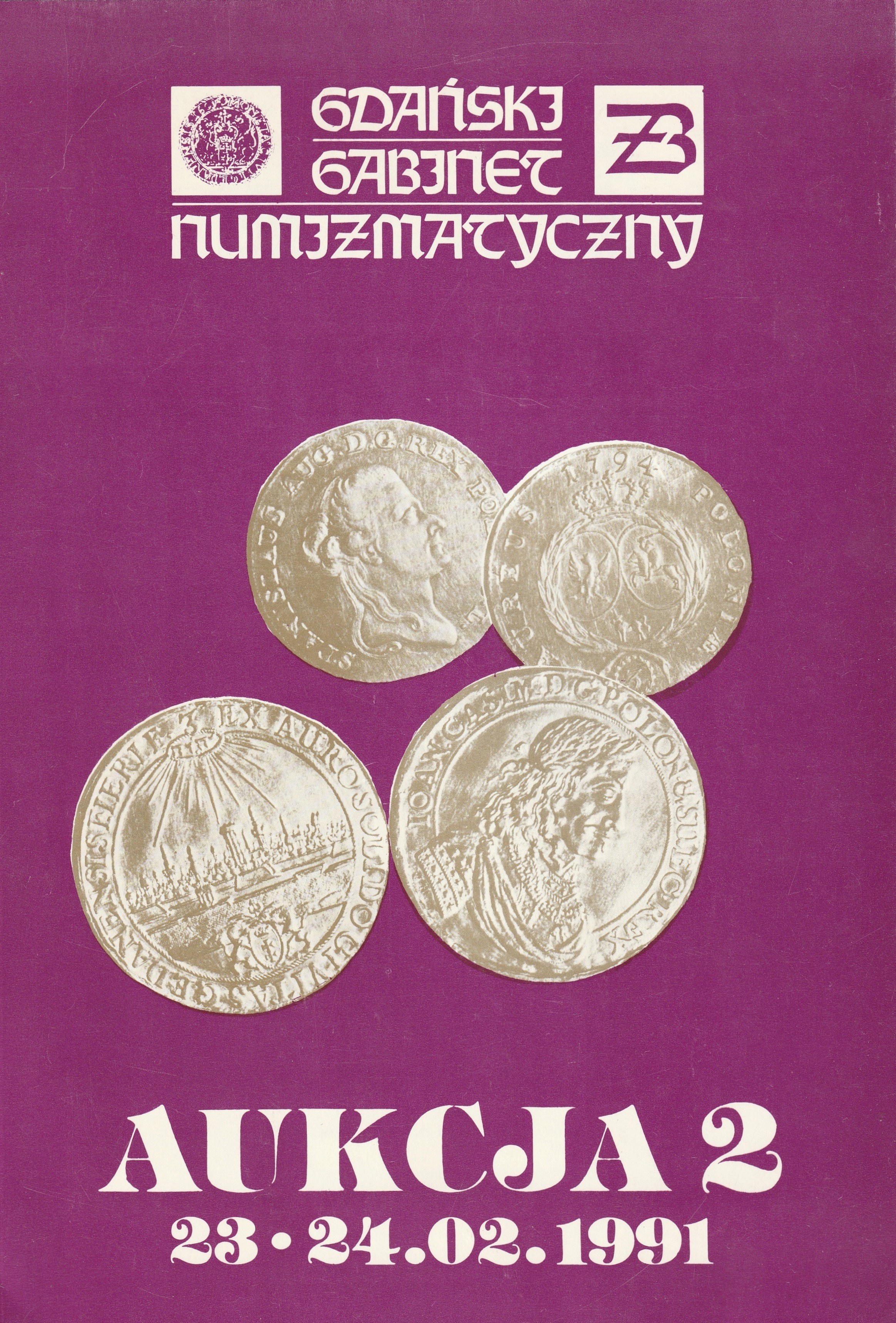 GDAŃSKI GABINET NUMIZMATYCZNY. 1) Aukcja nr 1 28-29.07.1990, str. 60+tab. 40 z fot. cz.-b. 895, luzem dołączona lista wynikowa (str. 2); 2) Aukcja nr 2 23-24.02.1991, str. 74+tab. 24 z fot. cz.-b. 985, st. db., wym. ok. 205x290 mm, luzem dołączona lista wynikowa (str. 2); razem 2 sztuki.