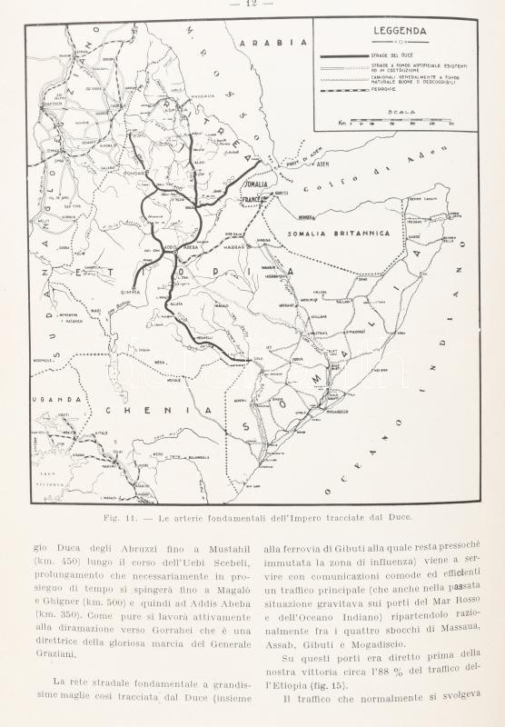 Giuseppe Pini: Problemi dell'Imperio. Le vie di Comunicazione. Roma, (1936), Stabilimento Tipografico del Gento Civile, 26 p. Fekete-fehér fotókkal, Etiópia-Afrika térkép vázlatokkal illusztrált. Olasz nyelven. Kiadói papírkötésben, kissé foltos borítóval./Paperbinding, with little bit spotty cover. In Italian language.