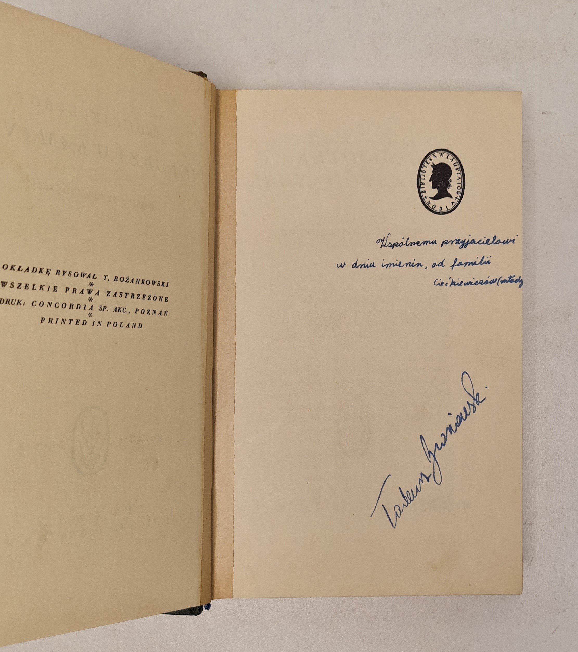 Przekład F. Mirandoli, okładka (wklejona w środku) T. Rożankowski. Wydawnictwo Polskie Wagnera, Poznań. Wym. 20x14cm, stron 308. Oprawa introligatorska półpłócienna (niewielkie otarcia, przybrudzenia), ozdobna wyklejka, dedykacja piórem, karty czyste, pojedyncze karty podklejane.
