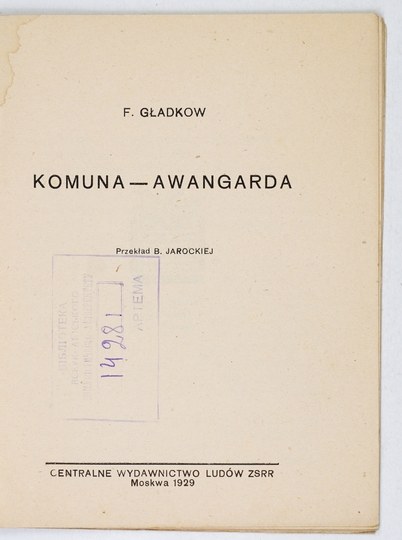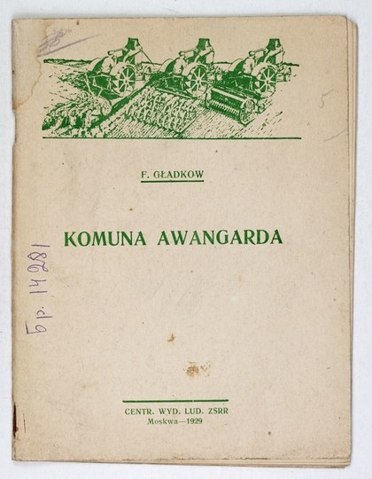 GŁADKOW F[iodor] - Komuna-awangarda. Przekład B. Jarockiej. Moskwa 1929. Centralne Wydawnictwo Ludów ZSRR. 16d, s. 31, [1]. brosz.
