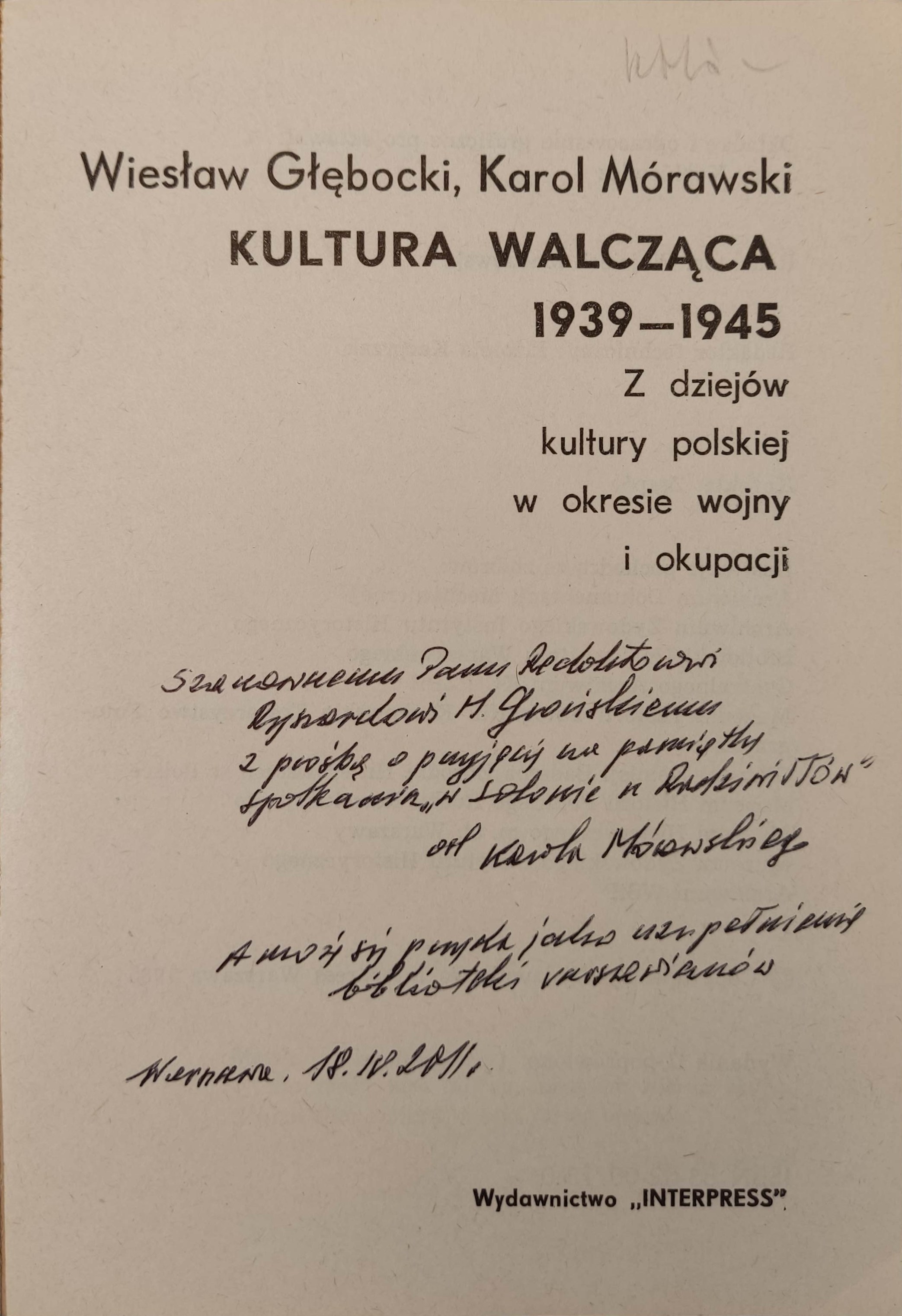 GŁĘBOCKI W., MÓRAWSKI K. - KULTURA WALCZĄCA 1939-1945. Z dziejów kultury polskiej w okresie wojny i okupacji