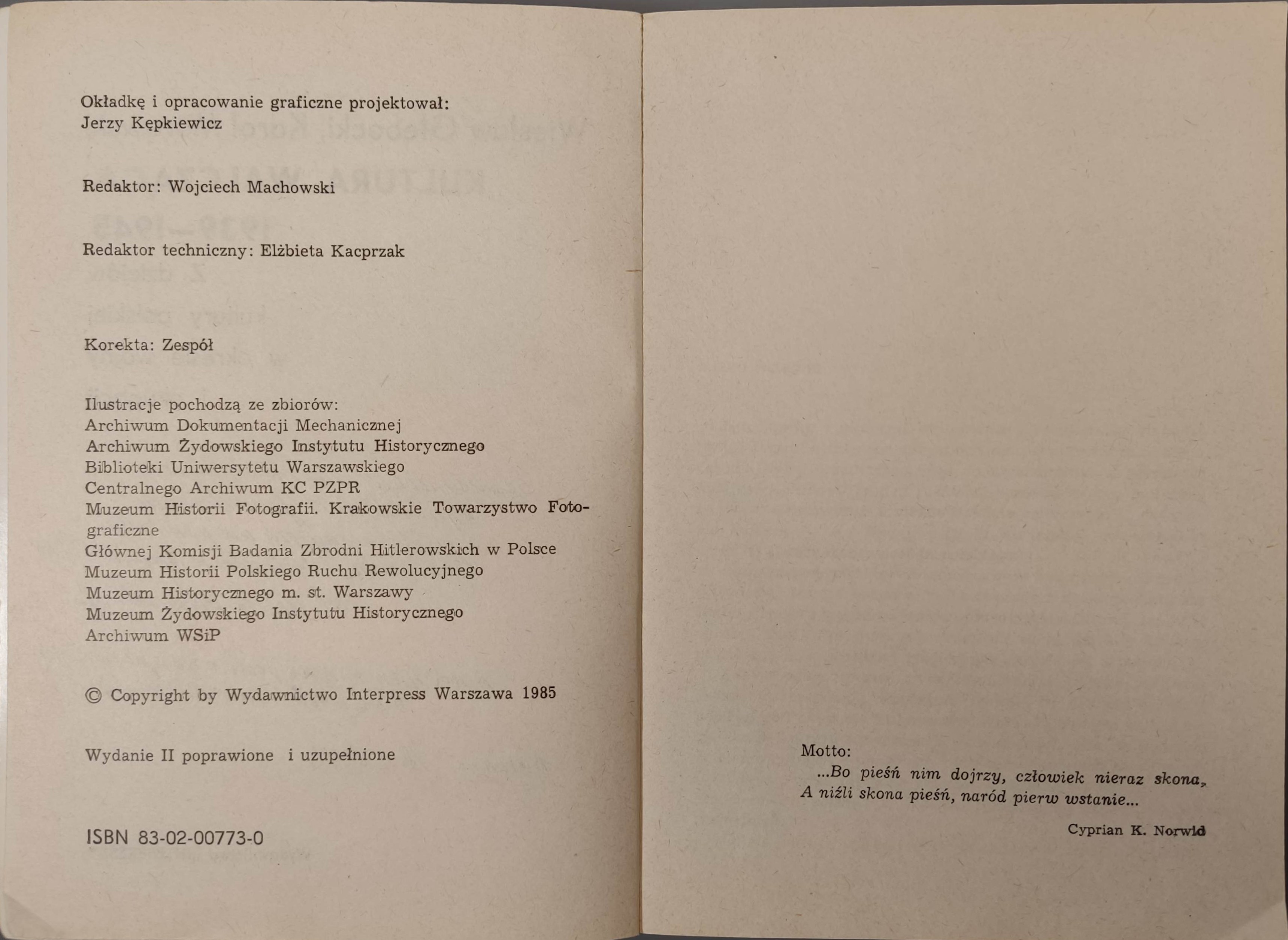 Wyd. Interpress. Warszawa 1985. Wym. 20,2x14cm; stron 324. Oprawa broszurowa(otarcia, przetarcia oprawy, zgięcia grzbietu i okł., przybrudzenia). Okładkę projektował J. Kępkiewicz. Odręczna dedykacja na karcie tytułowej od Karola Mórawskiego dla R. M. Grońskiego.