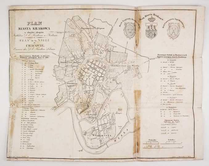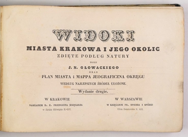 GŁOWACKI J[an] N[epomucen] - Widoki miasta Krakowa i jego okolic zdięte podług natury przez ... oraz plan miasta i mappa jeograficzna okręgu według najlepszych źródeł ułożone. Wydanie drugie. Kraków-Warszawa [1848]. Nakł. D. E. Friedleina Księg. i Księg. Fr. Spiessa i Spółki. 16d podł. s. [6], k. 48, tabl. 24, mapa rozkł.1, plan rozkł. 1. opr. ppł. z epoki.