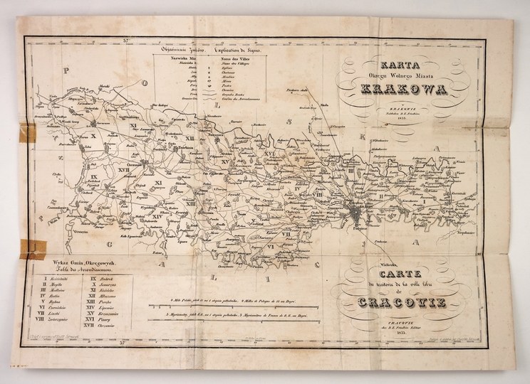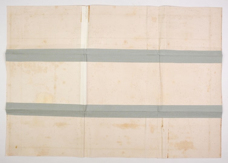 Opr. nieco otarta, podklejenia paskami papieru w grzbiecie od wewnątrz, plan i mapa podklejone płótnem i papierem na odwrocie wzdłuż miejsc złożenia, plan z przyciętym lewym marginesem; miejscowe zbrązowienia i zaplamienia papieru wewnątrz. Stan ogólny dobry.