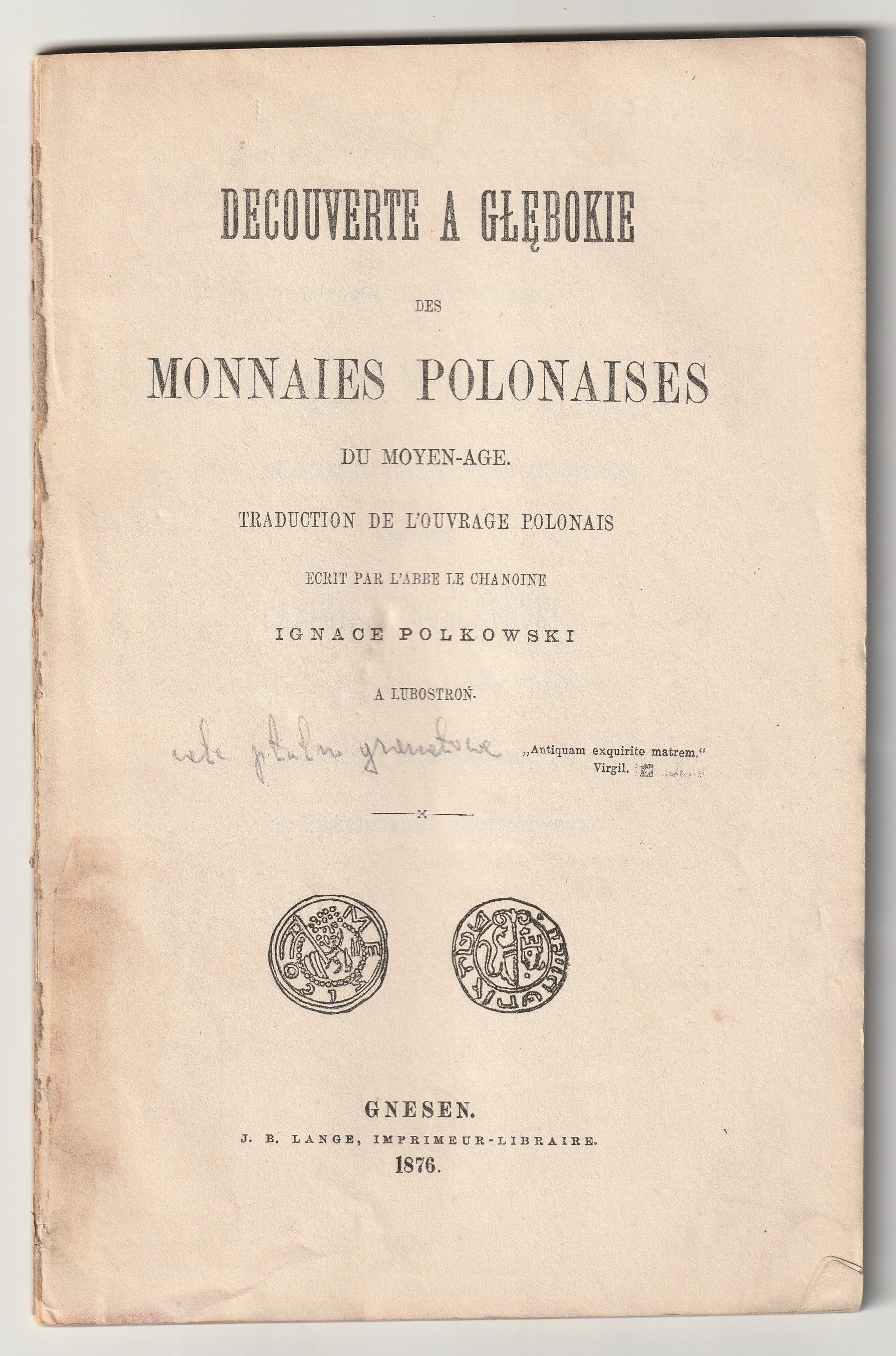 GNIEZNO, GŁĘBOKIE. Polkowski Ignacy, Decouverte a Głębokie des monnaies polonaises du moyen-age…, Gniezno 1876, str. 80 + 7 plansz z cz.-b. rys.; brak oprawy (pozostał grzbiet), zabrudzenia str. tyt., poza tym st. bdb.; wym. ok. 140x215 mm.