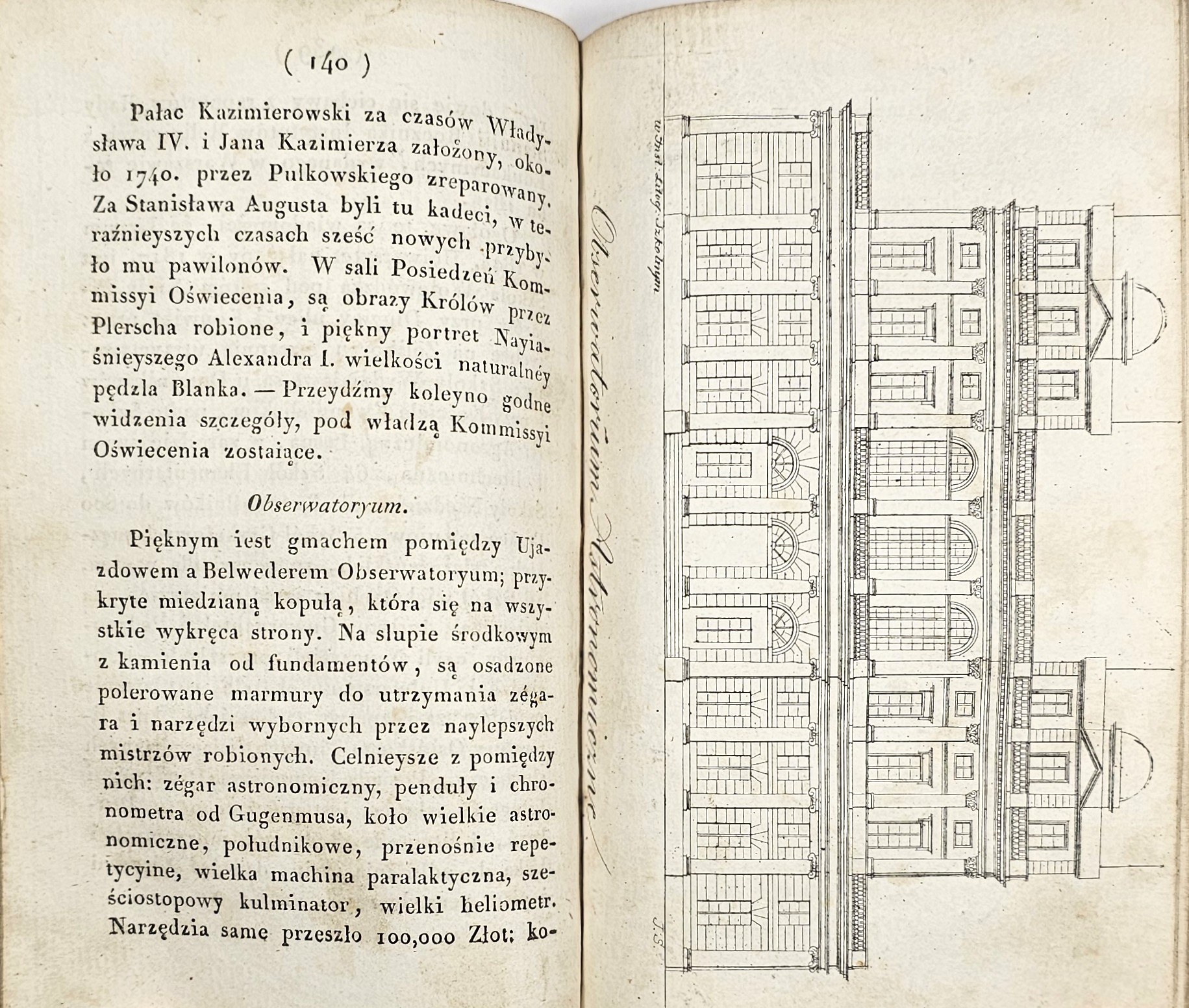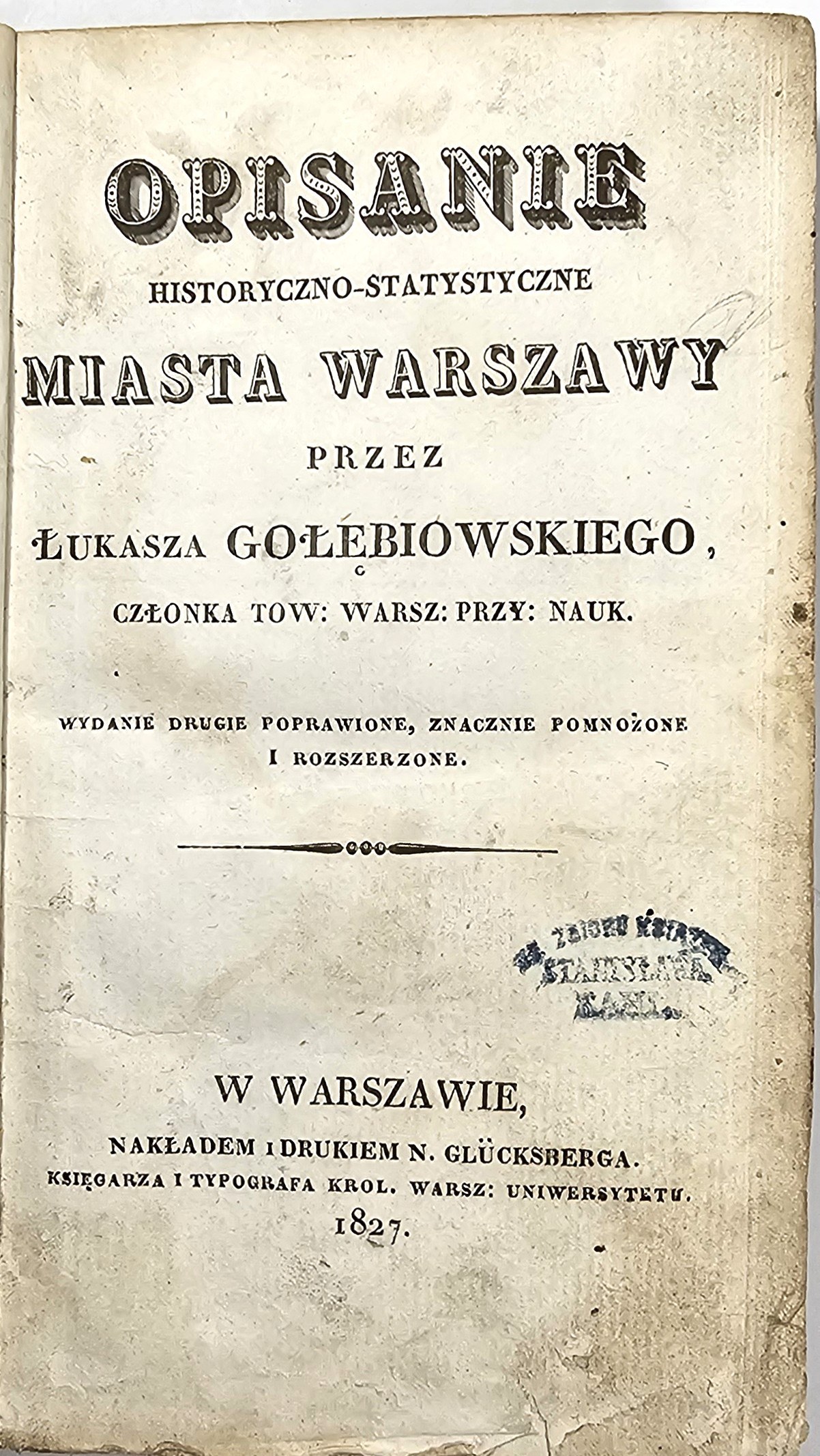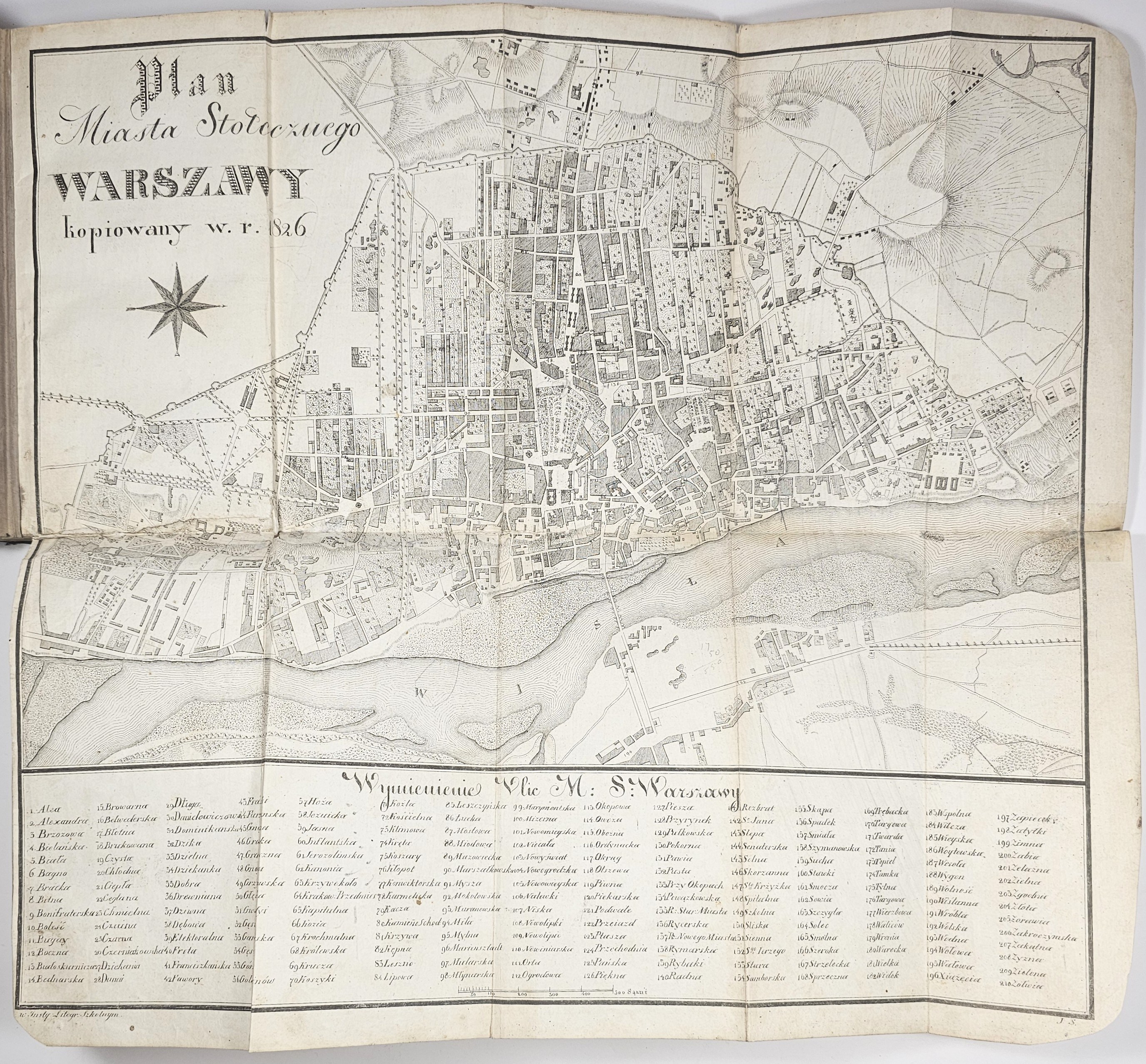 16.5 cm, s. [4], 252, 3 tab., 1 skł. tab., opr. ppł.: grzbiet naprawiany, karton zielony ozdobny z epoki,na str. tytuł. pieczątka własnościowa, część kart przybrudzona. Zachowane tablice: rozkładany Plan Miasta Stołecznego Warszawy kopiowany w r. 1826 oraz trzy widoki: Kościoła S. Krzyża, Dom Król. Towarzystwa Przyjaciół Nauk oraz Obserwatorium Astronomiczne. Rzadkie.