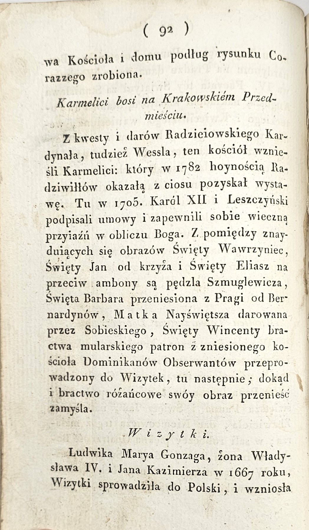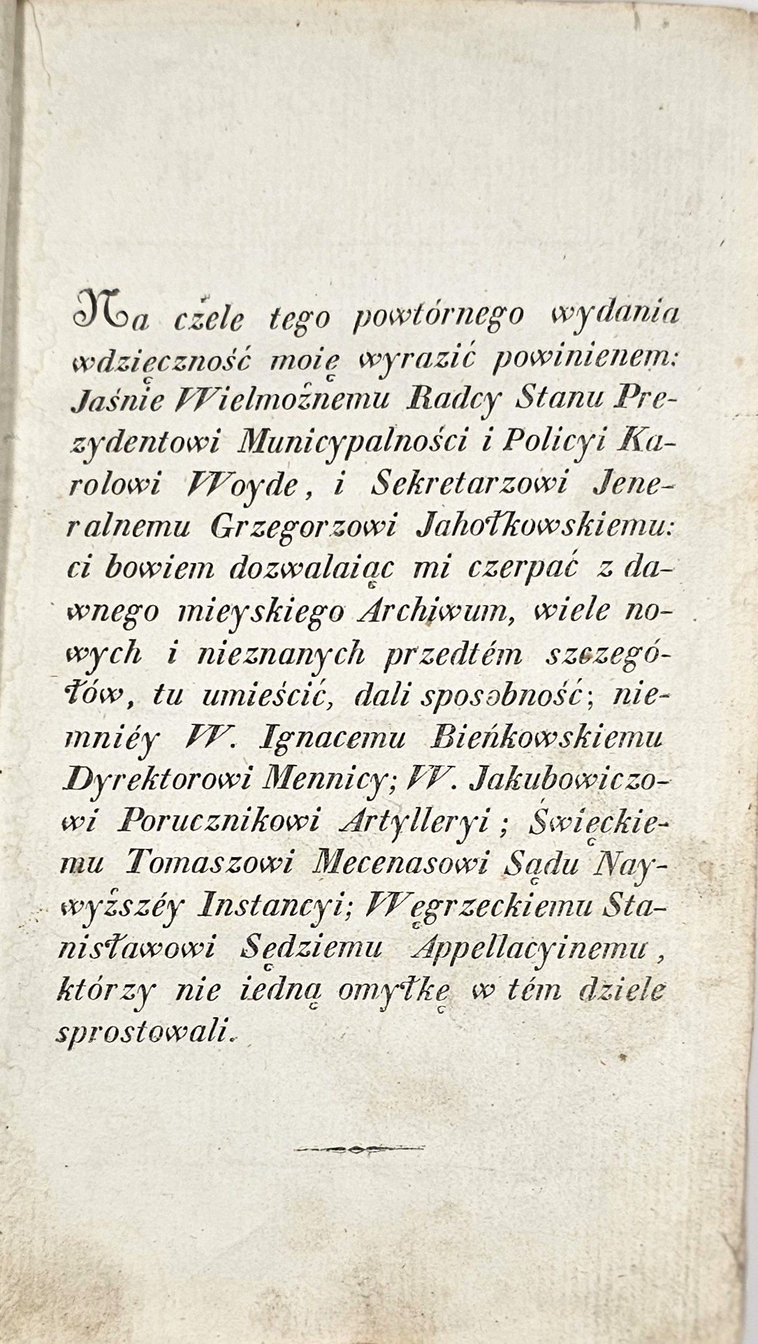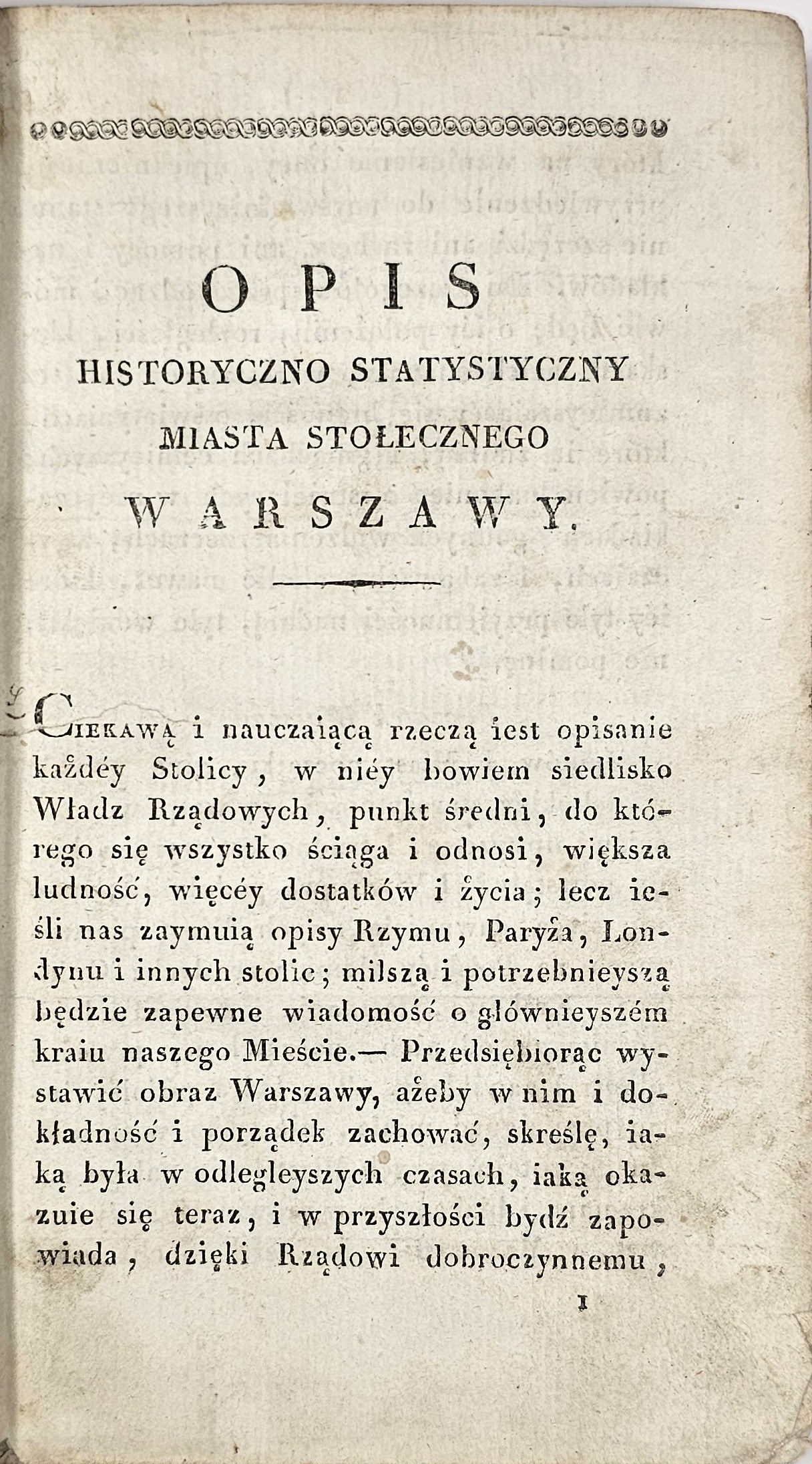 16.5 cm, s. [4], 252, 3 tab., 1 skł. tab., opr. ppł.: grzbiet naprawiany, karton zielony ozdobny z epoki,na str. tytuł. pieczątka własnościowa, część kart przybrudzona. Zachowane tablice: rozkładany Plan Miasta Stołecznego Warszawy kopiowany w r. 1826 oraz trzy widoki: Kościoła S. Krzyża, Dom Król. Towarzystwa Przyjaciół Nauk oraz Obserwatorium Astronomiczne. Rzadkie.