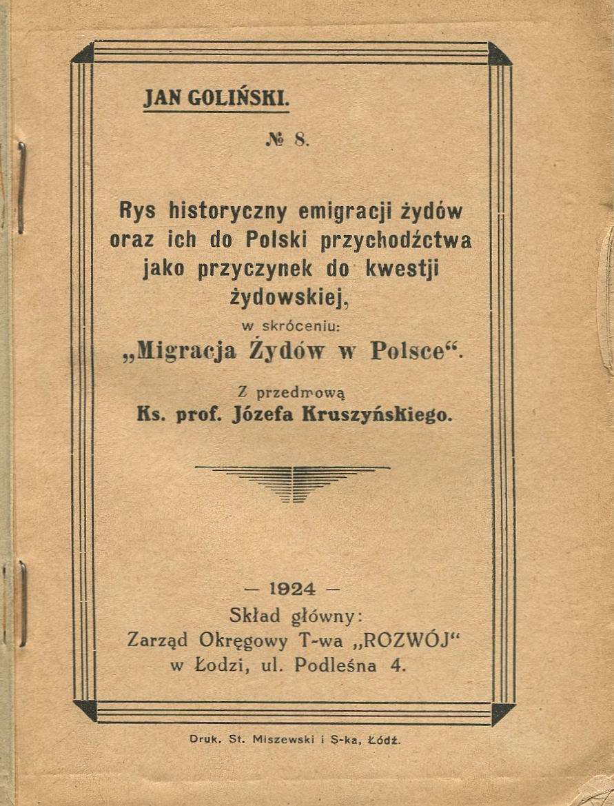 Łódź 1924. Towarzystwo "Rozwój". Biblioteka Polityczno-Społeczno-Żydoznawcza, nr 8. 11,5x15 cm, str. (2), IV, 62, (2), okładka miękka. Stan dobry (drobne naddarcia okładki, minimalny ubytek papieru na grzbiecie).