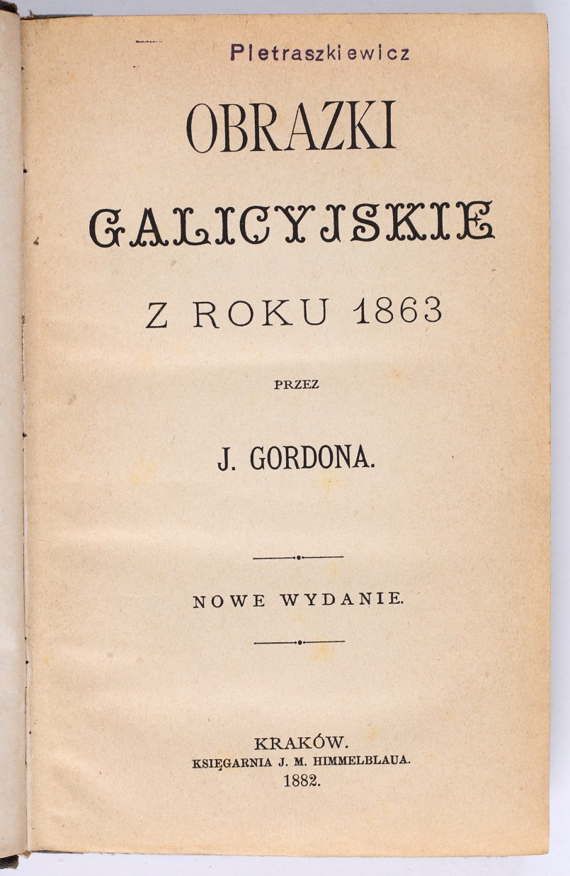 GORDON Jakub - Obrazki galicyjskie z roku 1863. Nowe wydanie. Kraków 1882. Księgarnia J. M. Himmelblaua.